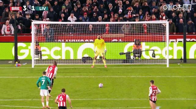 范戴克禁区线上踢倒塔瓦拉,在VAR提醒下判给了布伦特福德点球!蒂亚戈主罚命中!!!利物浦1-3落后!!!