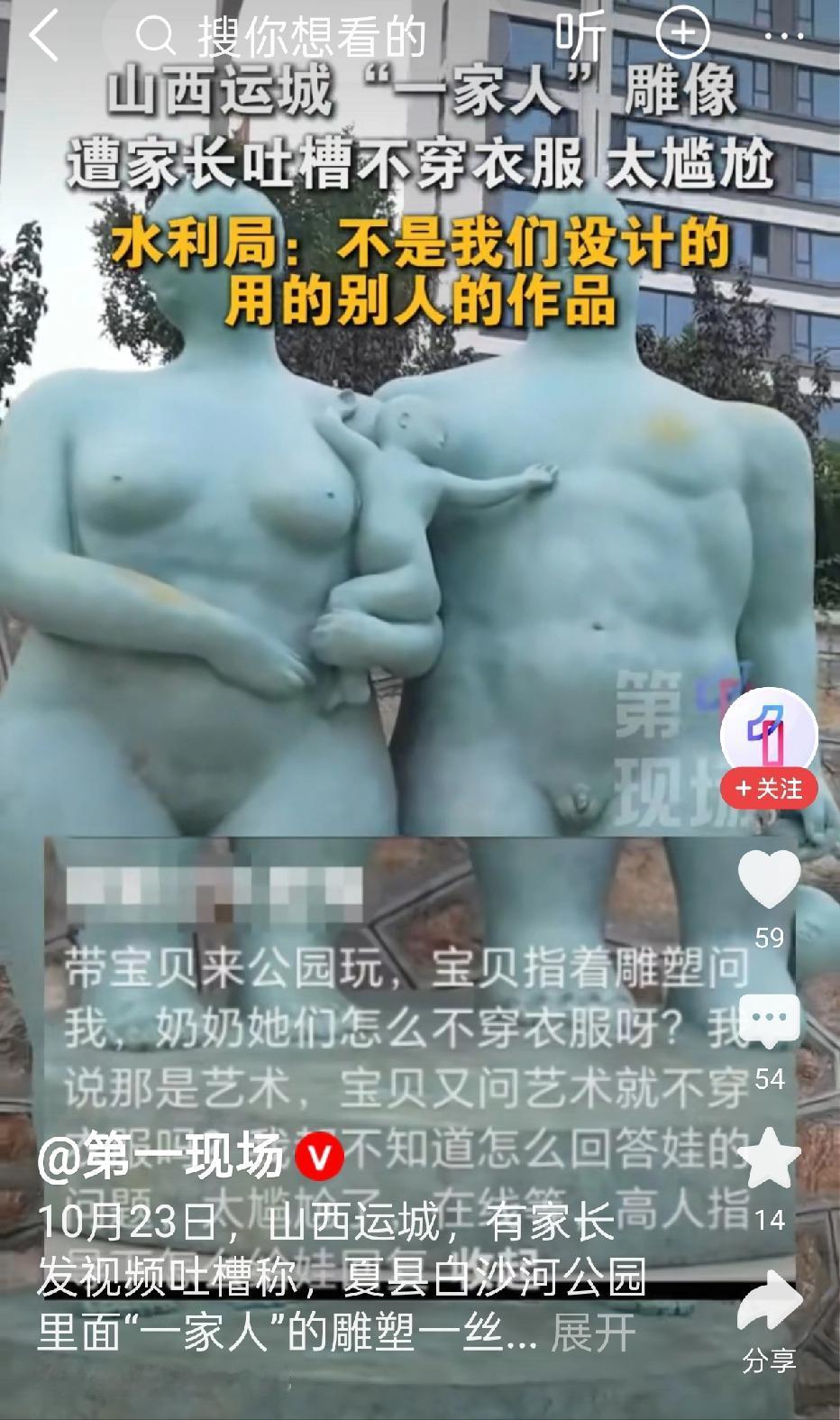 过去北京人有句幽默的话,叫谁看谁流氓。啥意思?就是马路上哪位女士穿的少点儿、露得多点儿的话,穿的人无可非议,而没完没了看的人才是流氓。为啥要说到这句话呢?皆因山西运城某个公园里立起了名为“一家人”的雕像,又遭到某些人的不满了。 雕像雕得好坏,仁者见仁智者见智,咱在这里不讨论。且令这些人反感的也不是雕像的造型,而是雕像都没穿衣服。对此,我的看法是:早在五六百年前的意大利文艺时期,那些裸替的雕像和绘画就已经风靡世界了,且成为了人类艺术史上的不朽杰作。怎么到了几百年后的今天,我们这里的人对这样的艺术作品就那么的不能容忍、不能接受呢? 据说当年徐悲鸿等人率先领导艺术界人士画裸体素描的时候,就曾经引起了不少传统卫道士的抨击。但后来的事实证明,在艺术的追求上,他们做的不但没有错,还起到了先驱的作用。现如今的艺术院校里,人体写生素描课怕是早已就列入为必修课了吧!所以我询问那些一见了裸体画作就跳出来拿孩子说事儿的人一句:世界上已经看了数百年都未造成啥不良后果的艺术品,咋到了你这就这么敏感了呢?难道除了你们这里,别的地方都没有孩子了吗? 说句实话,叫的响的那些人也未必就不爱看裸体的作品,只是喜欢在没人的时候自己偷偷的看罢了,装什么假正经呀! 孩子们的未来如何?绝不取决于一两件艺术作品!