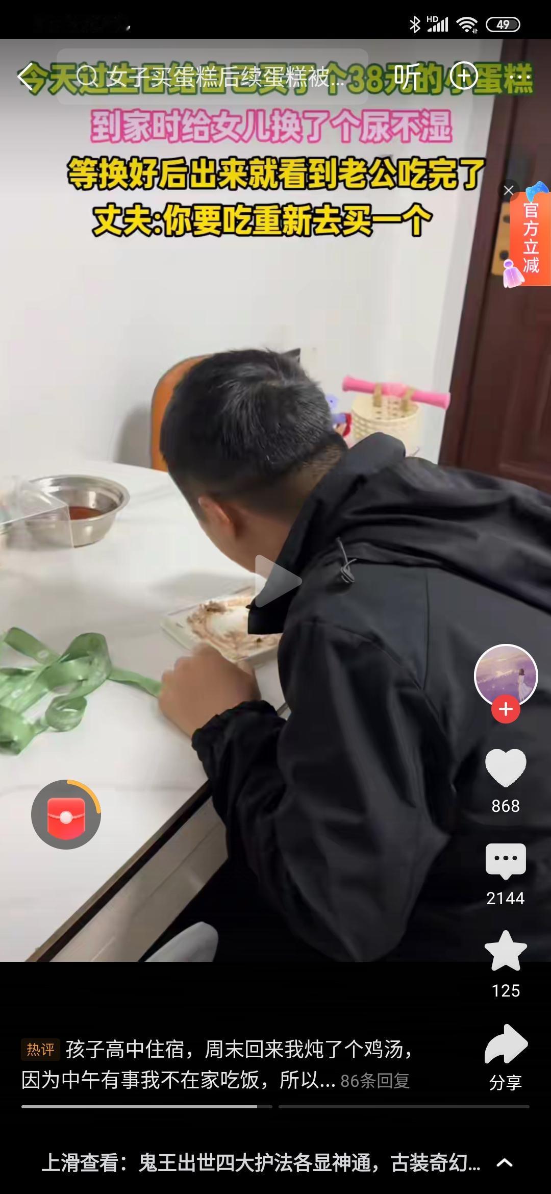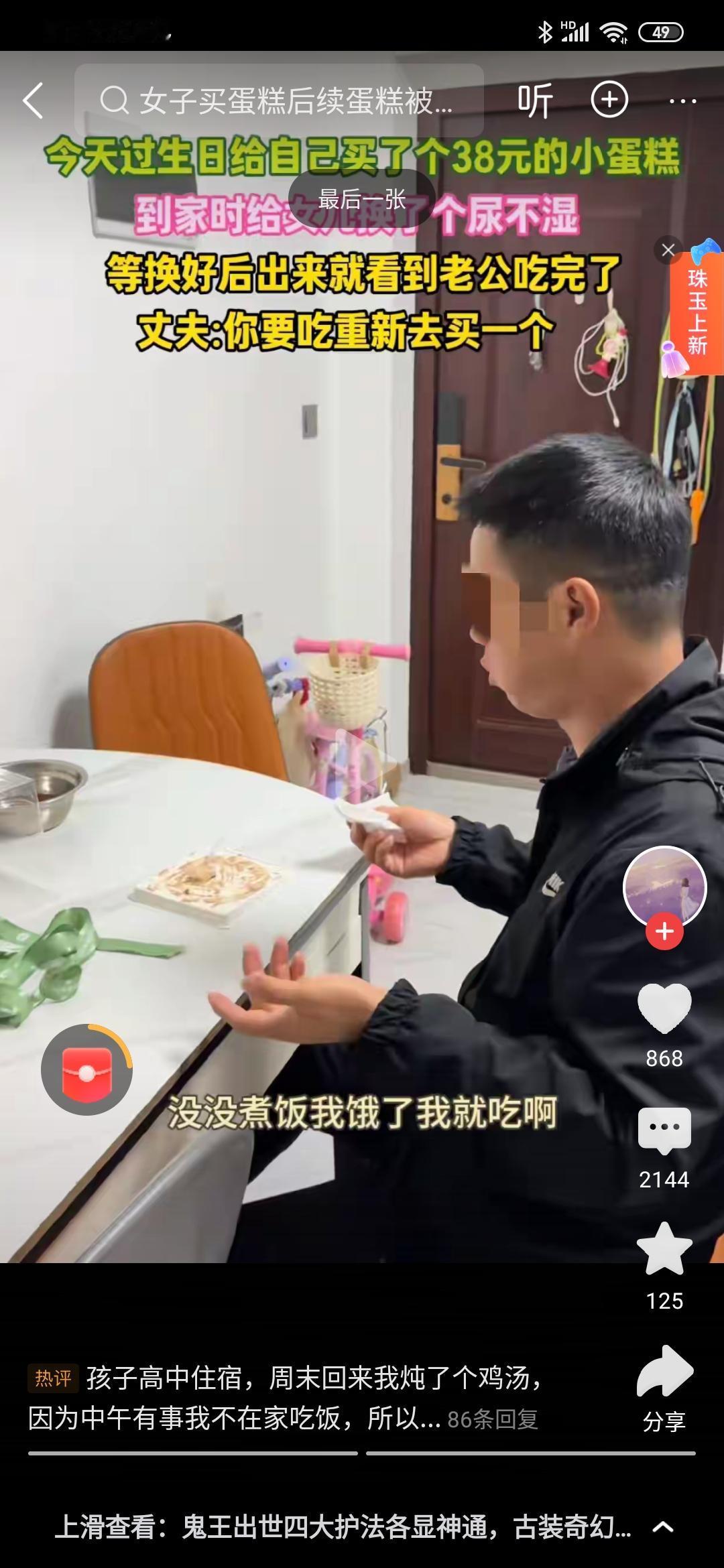 女子生日自己给自己买了个38元的小蛋糕,给孩子换完尿不湿出来就被丈夫吃完了,还说肚子了饭没有煮好就吃完了。 女人听完瞬间委屈极了,自己过生日丈夫没有给买生日礼物,没有做顿顿给自己。蛋糕自己准备的,还一口不给自己留。 说白了这样的男人只会在乎自己 如果这男人心疼老婆,再好吃的东西都不会全部吃完,我老公在累在饿给他留的东西,他都问我还吃不吃,如果我不吃他才会吃完,要要吃就留给我,蛋糕那更是不会,因为只有生日才买。 对此网友说:如果心疼丈夫,也不会计较他吃完了一块蛋糕,也可能丈夫在外面风餐露宿累了一天,家里没做好饭,只能狼吞虎咽的吃块蛋糕垫垫。 外卖那么多,再点一块就好了,有什么可小题大做 竟然有外卖,丈夫为何不给老婆点一个,这意思就不对了,生活里没有小事,是看能不能感同身受,没有就是陌生人了