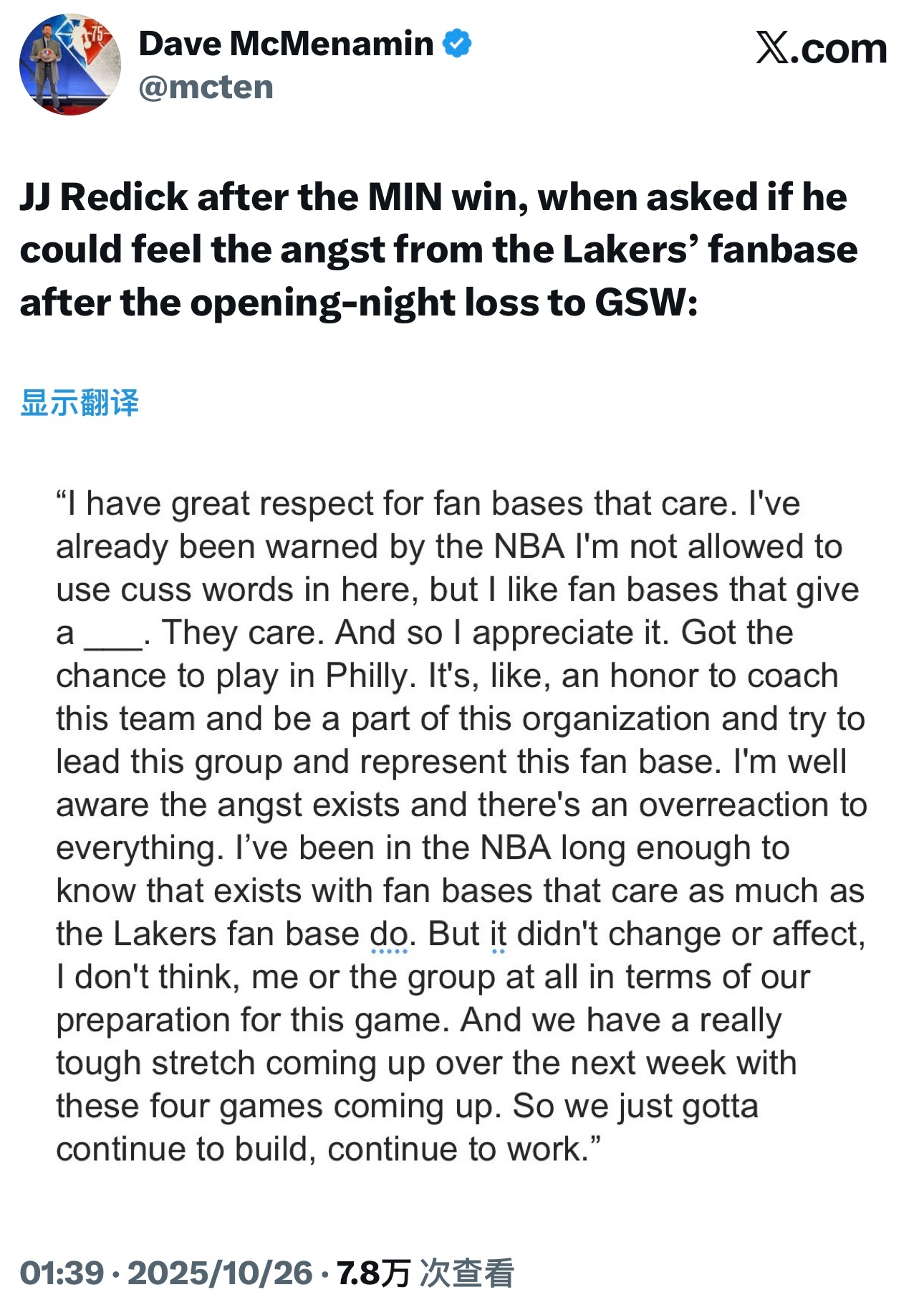 “我非常尊重那些关心球队的球迷们,我已经被NBA警告过,不能在这里说脏话,但我喜欢那些真正在乎球队的的球迷,所以我很欣赏这种态度。我曾有机会在费城打球。能执教这支球队、成为这个组织的一员、努力带领这个团队并代表这群球迷,对我而言是一种荣幸。我很清楚这种焦虑是存在的,而且球迷对所有事情都会有过度反应。我在NBA待的时间够长了,知道像湖人球迷群体这么在乎球队的球迷,出现这种情况是很正常的。但我认为,这完全没有改变或影响我和球队为这场比赛所做的准备。而且接下来一周我们会迎来一段非常艰难的赛程,要打四场比赛。所以我们必须继续打磨、继续努力。”