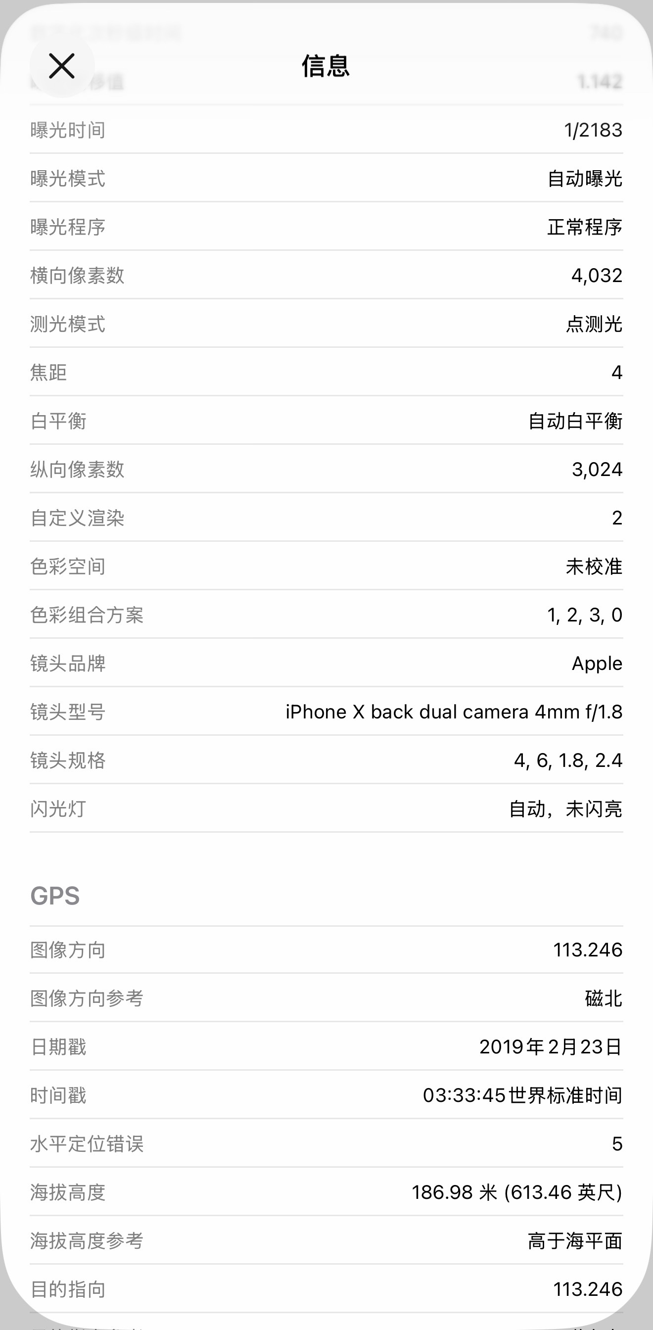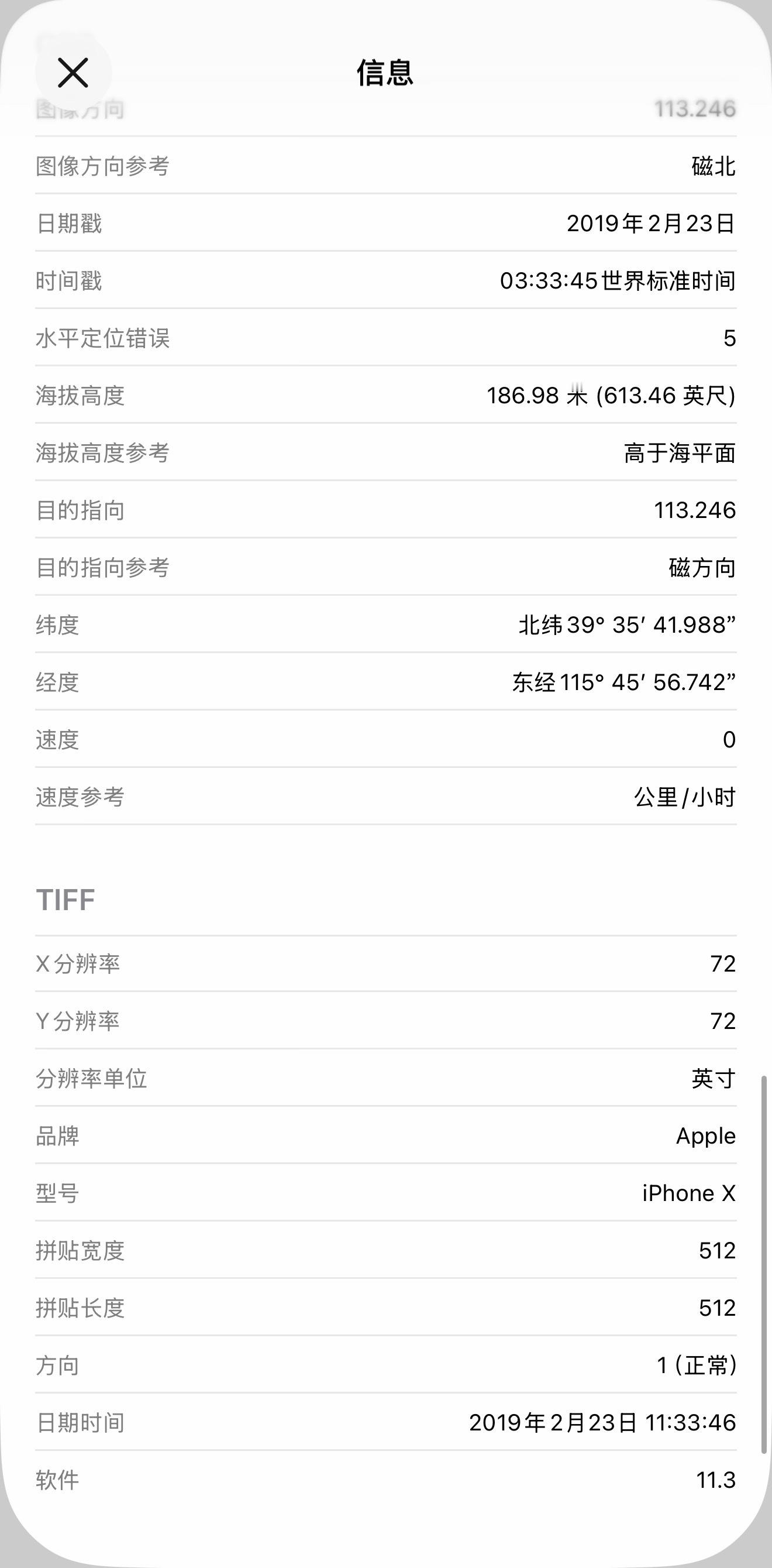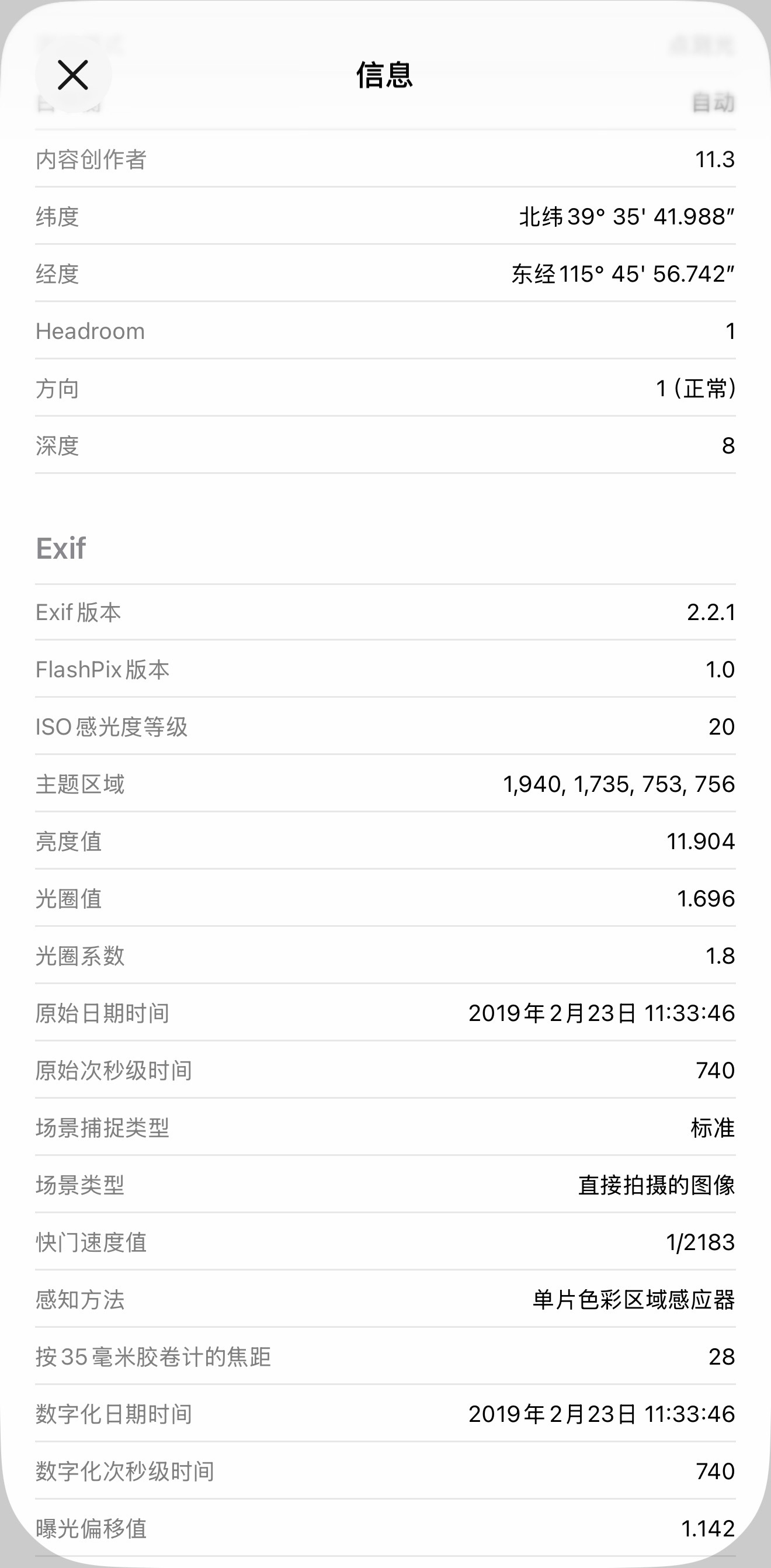 来看一下用苹果手机拍的照片会显示多少信息,经度、纬度、海拔高度、镜头型号、上次打