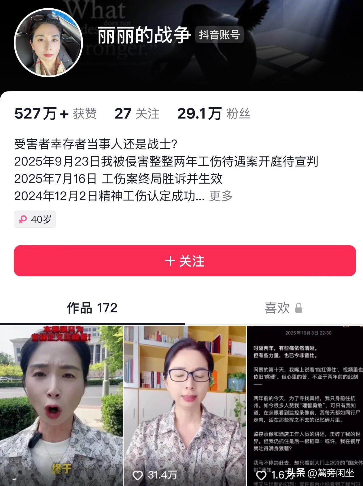 崔丽丽为了芝麻丢了西瓜 崔丽丽有了新动作,她的个人账号主页标签上删除了“为千万女性同胞发声”的文字,头条账号同时隐藏了个别视频。 崔丽丽老公观东山曾发布过一条视频,主动喊网友来围观破防妹,其账号至今未更新有内容,主页保持原状。 崔丽丽夫妇的本意是想要合法获得工伤待遇赔偿,没想到崔丽丽过犹不及,动作过猛翻车了。 9月23号那天,法院没有当庭宣判,崔丽丽的焦虑倍增,她把对未知的恐惧,转嫁到无辜的网民头上,怼天怼地怼空气,崔丽丽这种扩大战争的打法非常不可取,一个人若失去了群众基础,怎么可能会有好的结果。 崔丽丽为了和网友争输赢,丢失了自己的初心。真的是捡颗芝麻丢了西瓜 如今,崔丽丽的账号标签有改动,内容有隐藏,说明她对自己的言行有了新的思考和定位。