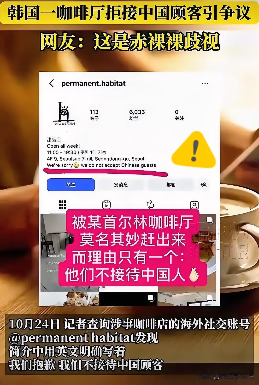 韩国一咖啡厅当场赶走都已经点了咖啡的中国顾客,表示不接待中国人,店铺门口还用英文贴上不招待中国顾客。咖啡店老板回应此事说:虽然从人性的角度上说很遗憾,但这就是我! 这事儿就发生在首尔圣水商圈,那家店之前还是不少中国博主推荐的打卡地呢 。有个在韩国常住的中国网友,10月22号特意跑去光顾,刚点完单跟朋友说中文,店主立马过来问是不是中国人,跟着就把人往外赶,咖啡影子都没见着。 网友气不过回去理论,要求提前声明不接待中国人,结果店主倒硬气,直接在海外社交账号上改了简介,用英文明晃晃写着“我们抱歉,我们不接待中国顾客” 。有人在网上质疑他,他就甩那么一句“虽然人性上遗憾,但这就是我”,现在连评论都给限制了,怕不是心虚了。 说真的,做生意讲究的是开门迎客,哪有看国籍下菜碟的?更何况还是已经点单的顾客,这操作不光没礼貌,简直就是赤裸裸的歧视。更讽刺的是,韩国总统之前都批评过针对外国人的仇恨示威,说有损国家形象,跟他们讲究的“多样性”根本不搭边 。 前段时间首尔地铁还有员工吐槽中国人“吵闹”,想取消中文广播,最后闹大了只能道歉 。其实哪是中国人有问题,分明是少数人被谣言洗脑了,比如有人瞎传“60%岗位被中国人抢了”,可实际数据里中国劳工才占12%。 咱也不是说所有韩国商家都这样,之前也有网友碰到过在咖啡店打工的韩国女演员,服务又热情又负责 。但架不住这种歧视人的店膈应人,本来出去消费是图个开心,结果碰一鼻子灰,换谁能不气? 这种把偏见当“个性”的老板,丢的不光是自己的脸,更是整个商圈的口碑。真当中国人离了他家咖啡就不行?说白了,不懂得尊重人的生意,根本做不长久。 各位读者你们怎么看?欢迎在评论区讨论。首尔星巴克 首尔站咖啡店