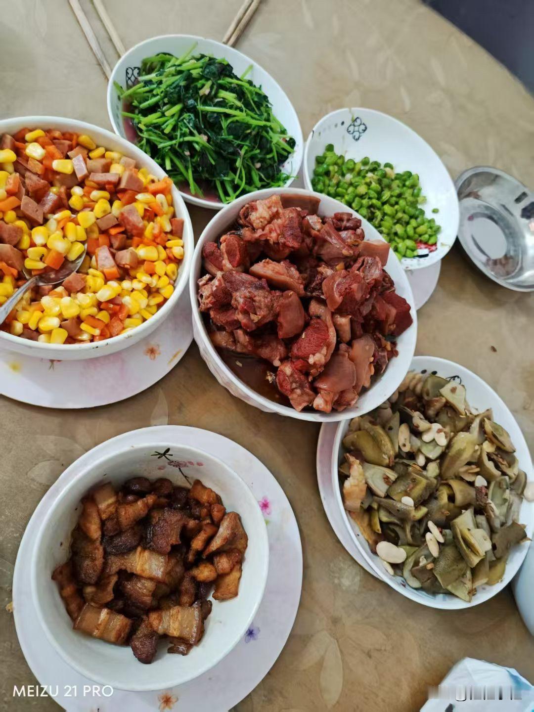 今天这桌家常菜直接,玉米胡萝卜混着火腿丁,甜脆口巨下饭;清炒的绿叶菜嫩得能掐出水,青豆颗颗入味儿。 最绝的是那盘红烧荤菜,肉炖得烂乎乎的,裹满酱汁一抿就化;红烧肉肥瘦相间,油香裹着酱味,配饭能炫两大碗!还有那盘腌菜脆爽解腻,这一桌荤素搭得刚好,全是家里的味道,吃着比下馆子舒坦多了~