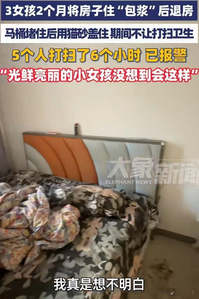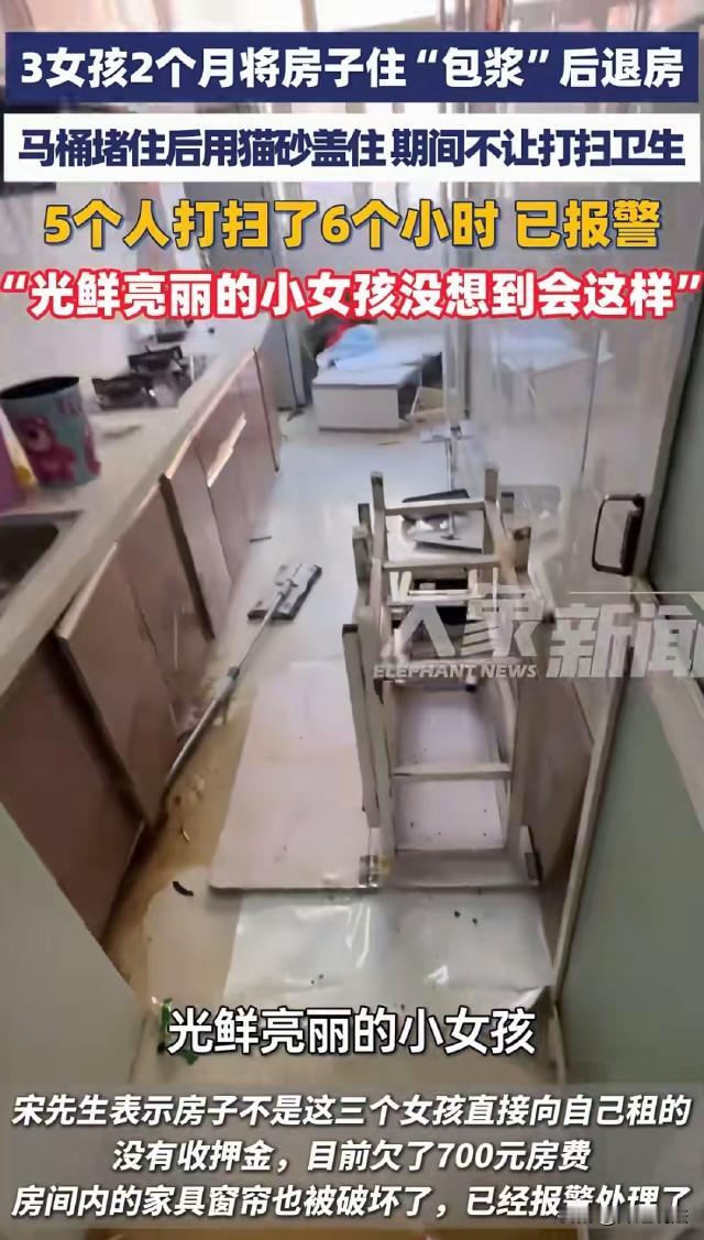 黑龙江齐齐哈尔,宋先生将房子租给了3个光鲜亮丽的女孩居住,结果三人住了两个月后连夜跑了。宋先生去收房,被熏得吐了两个小时。宋先生崩溃:房子都住包浆了!马桶堵了就一层一层盖猫砂,窗帘和墙都给我弄坏了,还欠了我700元的房租! 据大象新闻、红星新闻报道,宋先生的房子是两个多月前租出去的。 宋先生的房子不是直租,当时他听说对方是三个年轻又光鲜亮丽的小女孩,觉得她们肯定会爱惜房子,于是爽快的没收押金。 三人住进去后,并没有像宋先生想象的那样按时付房租,宋先生觉得小姑娘年轻,难免遇到点难处,晚几天给房租也没事。 可是,三人入住后,从来不让人进去打扫卫生,宋先生也天真的以为,年轻女孩爱干净,可能是她们自己把房子维护的很好,不用人进去打扫。 可谁知,几天前三人突然说不租了,并且是连夜退租,欠宋先生的700元房租也没给。 三人走后,宋先生过去收房,可一打开门宋先生差点被熏吐了,定睛一看,宋先生差点一口气没上来晕过去。 宋先生原本的房子,虽说装修不算顶级,可房间整齐明亮,家具完好。 三个女孩只住了两个月,房间地上全部都是垃圾,完全没有下脚的地方,偶尔地板露出来,地面也早就包浆了。 宋先生一间一间房查看,发现屋子里的桌子就剩一个架子,桌面不见了,原本好好的窗帘,也被弄成了破布,其他的家具和设施,也都有不同程度的损坏。 走到卫生间一看,宋先生一阵干呕,眼前一黑差点背过气去。 卫生间都是垃圾,地板上都是厚厚的污垢,马桶里都是猫砂,已经和坐便池齐边了,而猫砂里,全部都是大便。 宋先生崩溃了,叫了5个人来打扫卫生,5个人干了6个小时才将房间清理出来。 宋先生说,打扫卫生时他整整吐了2个小时。 宋先生怎么也想不明白,这么光鲜亮丽的小姑娘,怎么能将房子住成这个样子? 目前,宋先生已经报警。 本案从法律角度应该如何分析? 《民法典》第七百零九条规定:承租人应当按照约定的方法使用租赁物。对租赁物的使用方法没有约定或者约定不明确,依据本法第五百一十条的规定仍不能确定的,应当根据租赁物的性质使用。 在房屋租赁关系中,承租人有义务以合理、正常的方式使用房屋及附属设施。 三个女孩将房间弄得满地垃圾,地面包浆,桌子损坏、窗帘弄破,卫生间马桶用猫砂堵塞,且堆满大便。 女孩的行为显然违背了合理使用租赁房屋的基本要求,严重违反了租赁合同中隐含的对租赁物妥善使用的约定。 《民法典》第一千一百六十五条规定:行为人因过错侵害他人民事权益造成损害的,应当承担侵权责任。 女孩们在居住期间,故意或因重大过失对房屋的正常使用造成严重破坏,侵害了宋先生对房屋及附属设施的财产权益,构成侵权行为。 宋先生叫了5个人打扫卫生,花费6个小时才清理完房间,这部分清洁费用是因女孩们的侵权行为导致的直接损失,宋先生有权要求女孩们赔偿。 对于损坏的桌子、窗帘、马桶等物品,宋先生可以根据物品的购买价格、使用年限等因素,合理计算出损失金额,并要求女孩们予以赔偿。 另外,三人不仅将房子糟蹋的不成样子,还拖欠了房租。 《民法典》第七百二十二条规定:承租人无正当理由未支付或者迟延支付租金的,出租人可以请求承租人在合理期限内支付;承租人逾期不支付的,出租人可以解除合同。 女孩们未按时支付房租,在退租时还拖欠700元房租,这种行为构成了对租金支付义务的违反。 宋先生作为出租人,在租赁合同有效的前提下,有权通过合法途径要求女孩们支付所欠租金。 如果女孩们拒绝支付,宋先生可以凭借租赁合同以及相关的租赁事实证据,主张自己的租金债权。