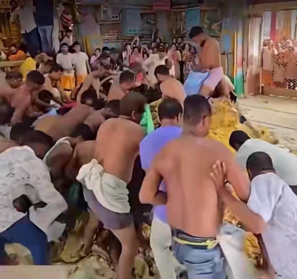 印度古吉拉特邦一座寺庙向民众免费“施饭”现场,地上堆成小山的不是沙堆,而是当地一种特别的饭,所有人都踩在饭上面哄抢,装进提前绑在腰上的袋子,踩完的饭拿回家吃,不觉得味道很重吗?实在不理解印度人为什么要把食物放地上