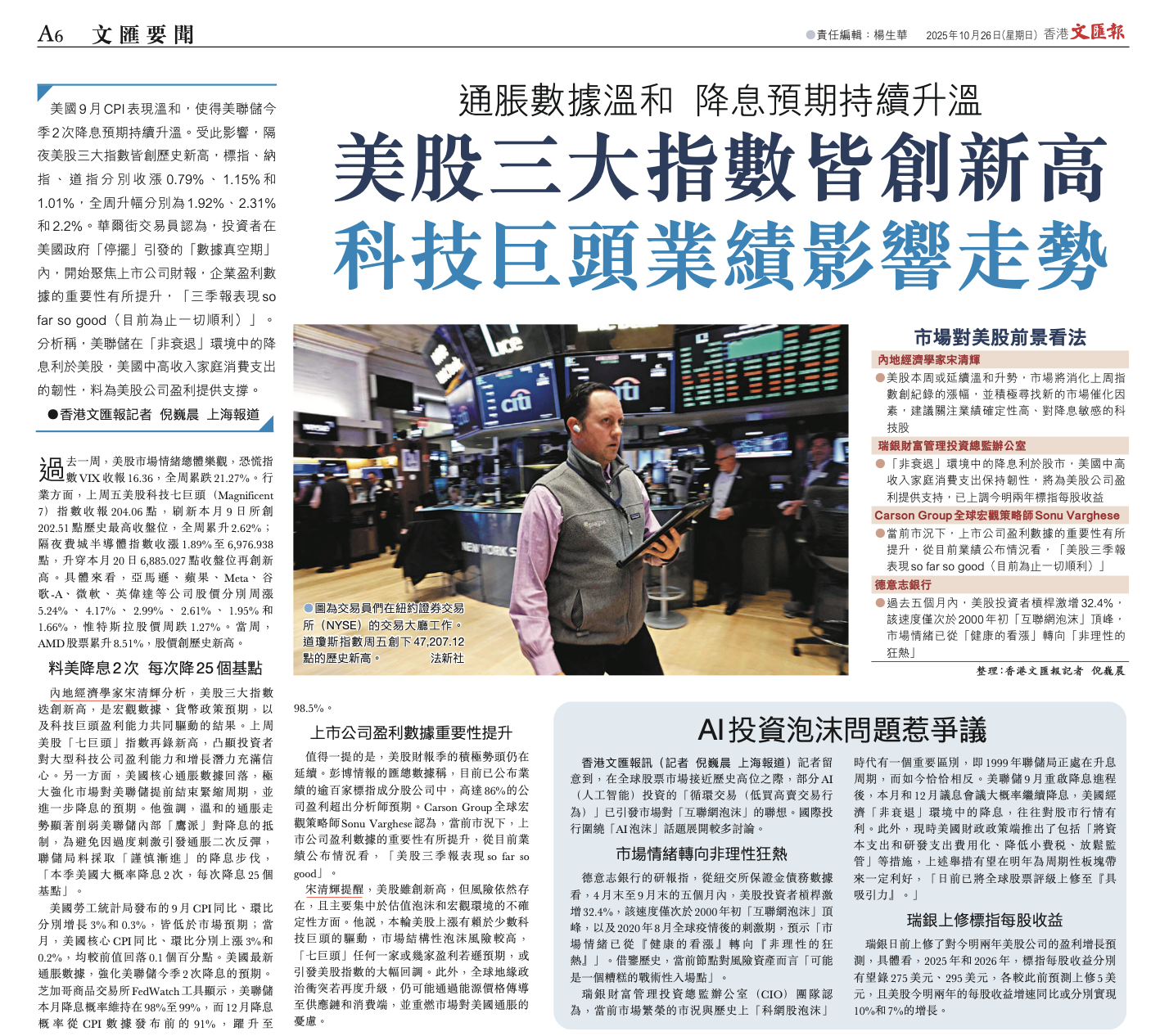 内地经济学家宋清辉分析,美股三大指数迭创新高,是宏观数据、货币政策预期,以及科技巨头盈利能力共同驱动的结果。上周美股“七巨头”指数再录新高,凸显投资者对大型科技公司盈利能力和增长潜力充满信心。另一方面,美国核心通胀数据回落,极大强化市场对美联储提前结束紧缩周期,并进一步降息的预期。他强调,温和的通胀走势显著削弱美联储内部“鹰派”对降息的抵制,为避免因过度刺激引发通胀二次反弹,联储局料采取“谨慎渐进”的降息步伐,“本季美国大概率降息2次,每次降息25个基点”。