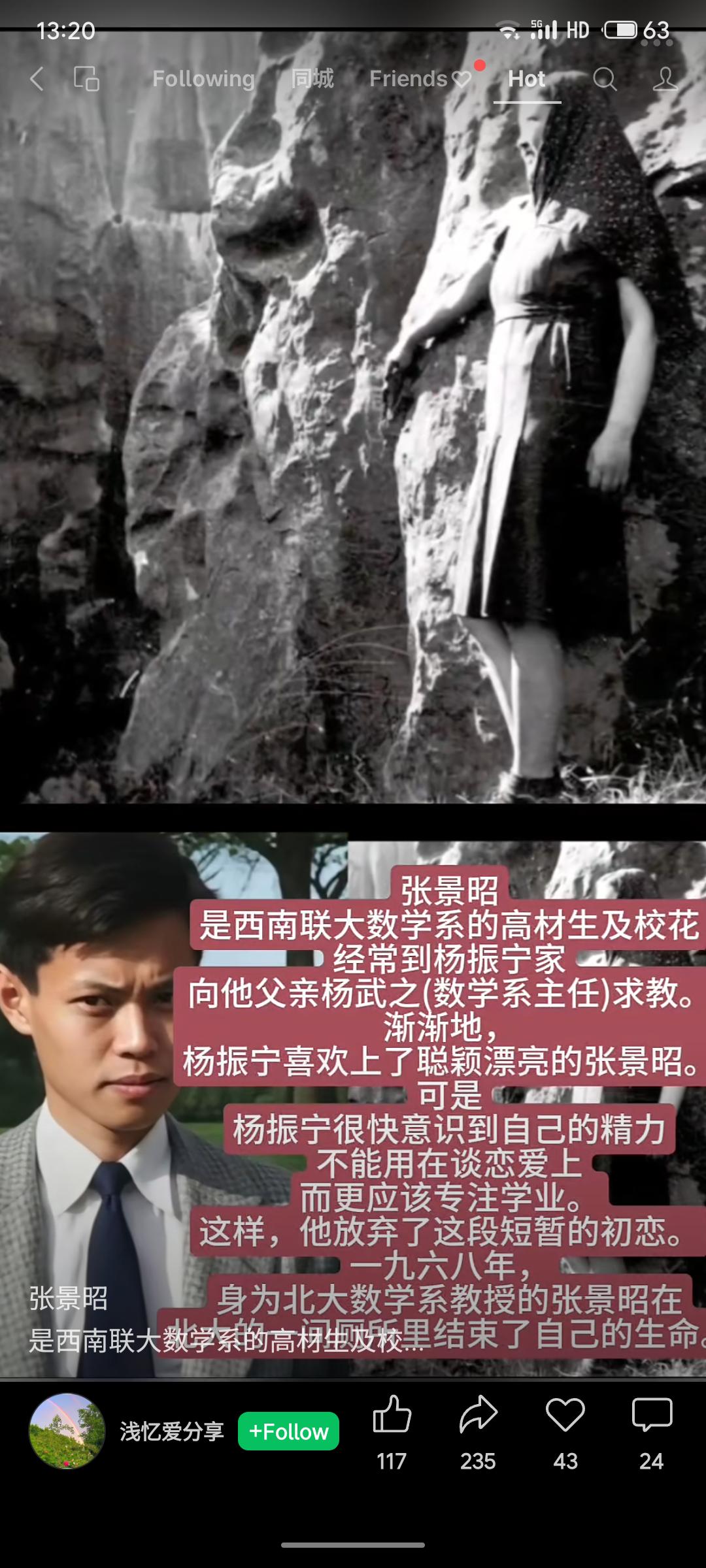 张景昭是西南联大数学系高材生,杨振宁曾对她萌生情愫,但为专注学业主动中止。她后任北大数学系教授,于1968年不幸离世。