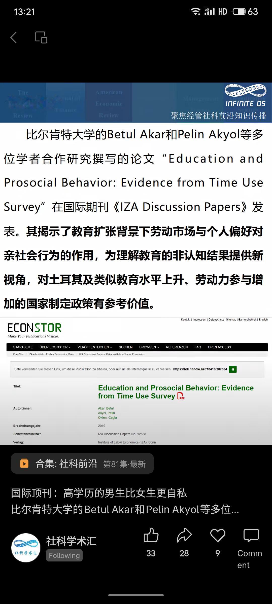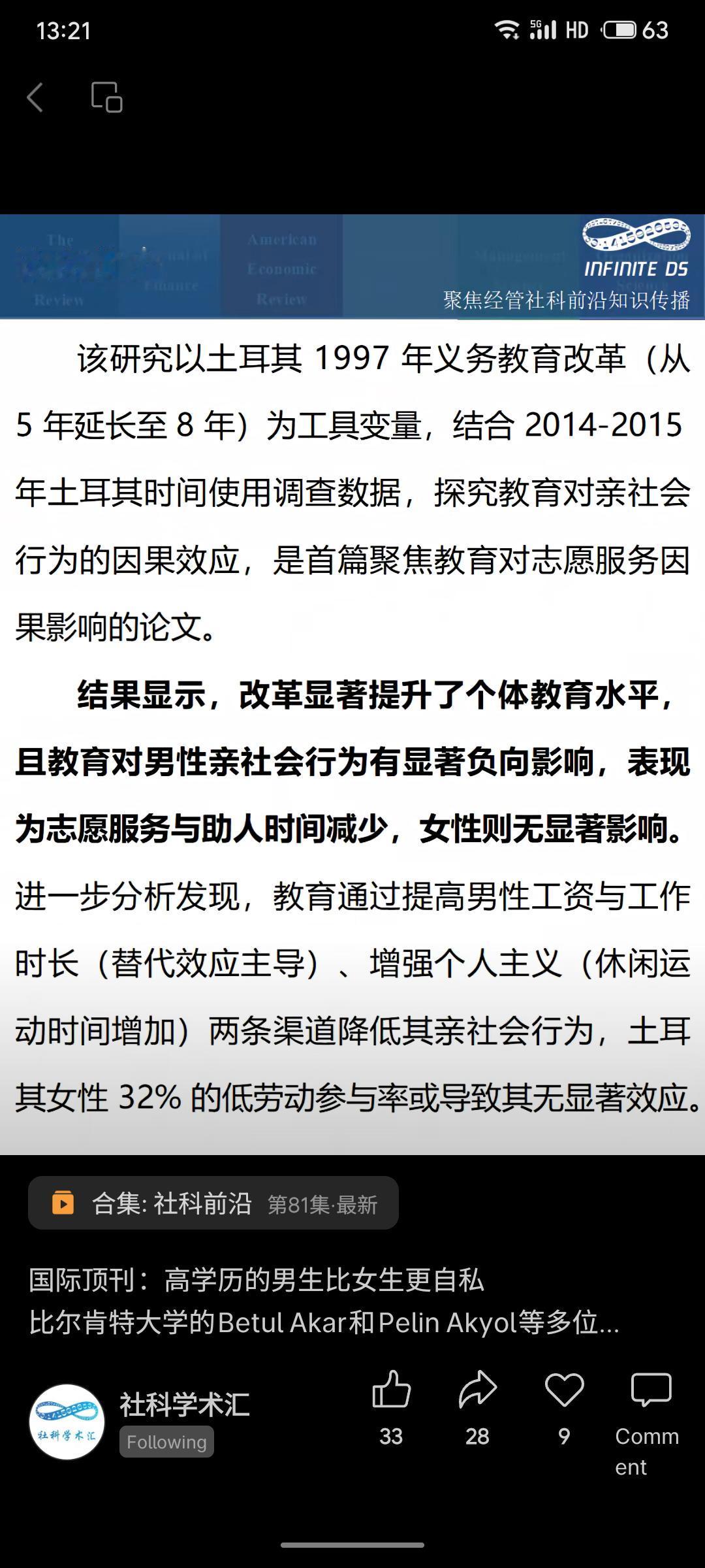 一项基于土耳其义务教育改革的研究发现,教育对亲社会行为的影响存在显著性别差异:教育水平提高会显著降低男性的志愿服务和助人时间,对女性则无显著影响。机制分析表明,教育通过提升男性工资(产生替代效应)及增强个人主义,减少了其亲社会投入。该研究揭示了教育影响的复杂性。