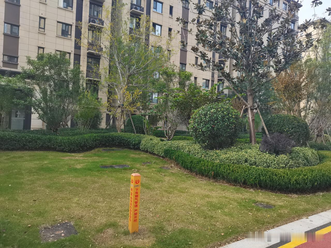 咱小区这环境是真不赖!你瞅这草坪收拾得多干净,边上的树啊灌木都修得整整齐齐,看着就舒服。楼底下这绿化弄得挺用心,有高有矮的植物搭配着,秋天了还有不少绿呢。 哎对了,草坪里那黄杆子可得注意,写着“下有燃气管道”,提醒别乱挖,安全这块小区想得还挺细。住这儿平时下楼遛弯,看着这清爽的环境,心情都能好不少。