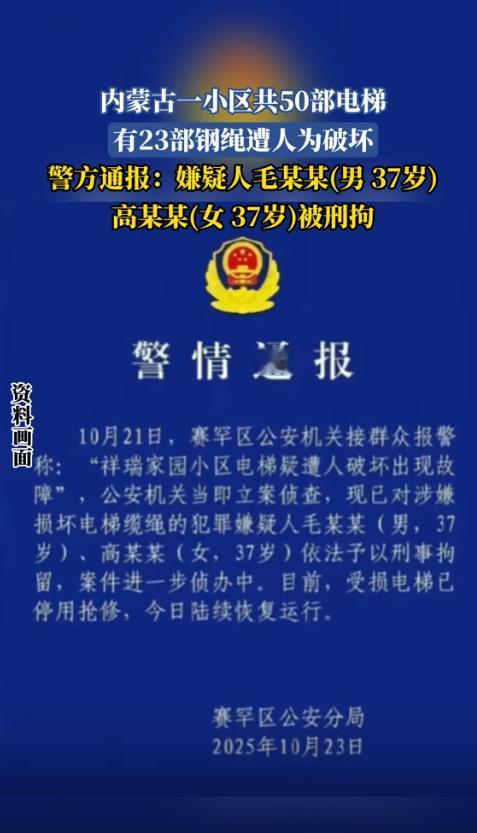 “简直坏到骨子里!”内蒙古呼和浩特,居民乘电梯时听见轿厢 “咯吱咯吱” 异响,赶快下电梯后告知物业,维保人员检查后,倒吸冷气,原来23 部电梯的关键承重钢绳全被人故意割断!这简单拿居民生命当儿戏,要是没人及时发现,满载乘客的电梯失控坠落,后果根本不敢想!居民们又慌又气,报警后,帽子叔叔很快抓住犯罪人员。 据视点新闻10月24日报道,要不是这个小区里,有这位细心的女业主,可能一场涉及上百户家庭的惨剧就已经发生了。 那天早上,这位女士像往常一样坐电梯,突然听到一阵刺耳的“咯吱咯吱”声,那声音绝对不是电梯正常运行该有的动静,更像是金属被强行撕扯时发出的哀嚎。 她心里一咯噔,没敢犹豫,立马冲出电梯,直奔物业办公室,正是她这个“多管闲事”的举动,揭开了一场精心策划的阴谋。 物业接到报告后也不敢怠慢,赶紧联系了维保师傅,当经验丰富的老师傅打开电梯机房时,眼前的一幕让他倒吸一口凉气,整个人都僵住了。 本该坚固无比的电梯承重钢缆,竟然出现了整齐的切口,有些甚至只剩下几根细细的钢丝可怜地挂着,仿佛随时都会崩断。 这哪里是设备老化,这分明是有人拿着工具,一根一根蓄意剪断的!师傅不敢多想,立刻对整个小区的电梯进行排查,结果越查心越沉。 从1号楼到7号楼,足足23部电梯的“生命线”全被人动了手脚! 这个消息像一颗炸弹,瞬间在小区的业主群里炸开了锅,大家每天上下楼都要依赖的工具,竟然成了悬在头顶的“断头台”,这让谁能不害怕?愤怒和恐慌的情绪迅速蔓延。 “这是要干什么?想让我们所有人都掉下去吗?” “坏到骨子里了!这跟谋杀有什么区别?” 居民们的恐慌并非空穴来风,维保师傅说得明明白白,这种承重钢缆一旦在电梯运行中断裂,轿厢会瞬间失控,从十几层甚至几十层的高度坠落,里面的人根本没有生还的可能。 警方接到报案后迅速介入,很快就将两名犯罪嫌疑人抓获归案,虽然人抓到了,但一个巨大的问号却悬在了所有人的心头:到底是谁,能如此精准、如此大规模地对23部电梯同时下手? 要知道,电梯机房和轿厢顶部可不是公共厕所,想进就进,这些地方通常都上了锁,需要专门的钥匙或者权限才能打开。 一个外人,怎么可能在不惊动任何人的情况下,悄无声息地完成这么大的“工程”? 很多网友的分析一针见血:“查查物业内部人员或者被辞退的员工!” “绝对是熟人作案,不然谁知道机房钥匙放哪?” 这些猜测并非空穴来风,能接触到电梯核心部件的人,范围其实很小,要么是负责小区管理的物业工作人员,要么是与物业有合作关系的电梯维保公司人员,再或者,就是对小区情况了如指掌、并因某些纠纷怀恨在心的前员工。 他们熟悉小区的布局,知道监控的死角,甚至可能掌握着进入机房的钥匙或方法。 这种“内鬼”作案的模式,在过往的新闻中并不少见,有的是因为公司之间的商业纠纷,一方为了报复,就拿公共安全当筹码,有的是因为员工被辞退心生不满,便选择用这种极端的方式泄私愤。 无论动机是什么,这种行为的本质都是一样的——为了满足一己私利,完全不顾他人的死活,他们切断的不仅仅是钢缆,更是社会成员之间最基本的信任,是对公共安全的无情践踏。 这件事也给所有小区的物业管理敲响了警钟,23部电梯被破坏,这绝对不是一两个小时就能完成的,作案人员需要分批次、长时间地潜入不同楼栋的机房。 在这么长的时间里,小区的安保巡逻、监控系统难道就没发现任何异常吗?这暴露出小区在安全管理上存在着巨大的漏洞。 如果连电梯这种人命关天的设备都保护不好,又怎么能让业主们安心居住呢?法律的利剑必须斩向这种恶行。 目前,两位嫌疑人毛某某和高某某已经被警方刑拘。 根据我国刑法,故意破坏正在使用中的电梯等公共交通工具,足以危害公共安全的,即使没有造成人员伤亡,也构成了“以危险方法危害公共安全罪”。 这意味着,等待这两名嫌疑人的,将是法律的严惩,他们不仅要面对牢狱之灾,还必须承担维修23部电梯所产生的全部费用,这是他们为自己的歹毒行为必须付出的代价。 如今,受损的电梯正在陆续修复,但留在居民心中的阴影却难以散去,这件事让我们深刻地认识到,公共安全从来没有侥幸可言。 它需要物业的尽职尽责,需要法律的刚正不阿,更需要我们每一个人提高警惕,当你发现身边存在安全隐患时,请不要像往常一样漠视,或许你的一次提醒,就能挽救无数个家庭。 信源:视点新闻2025-10-24——内蒙古一小区共50部电梯,有23部钢绳遭人为破坏,警方通报:嫌疑人毛某某