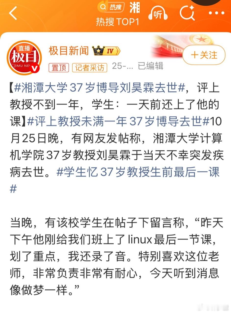 湘潭大学37岁博导刘昊霖去世又是突发疾病,才37岁…[祈祷] 这年头健康成了最玄