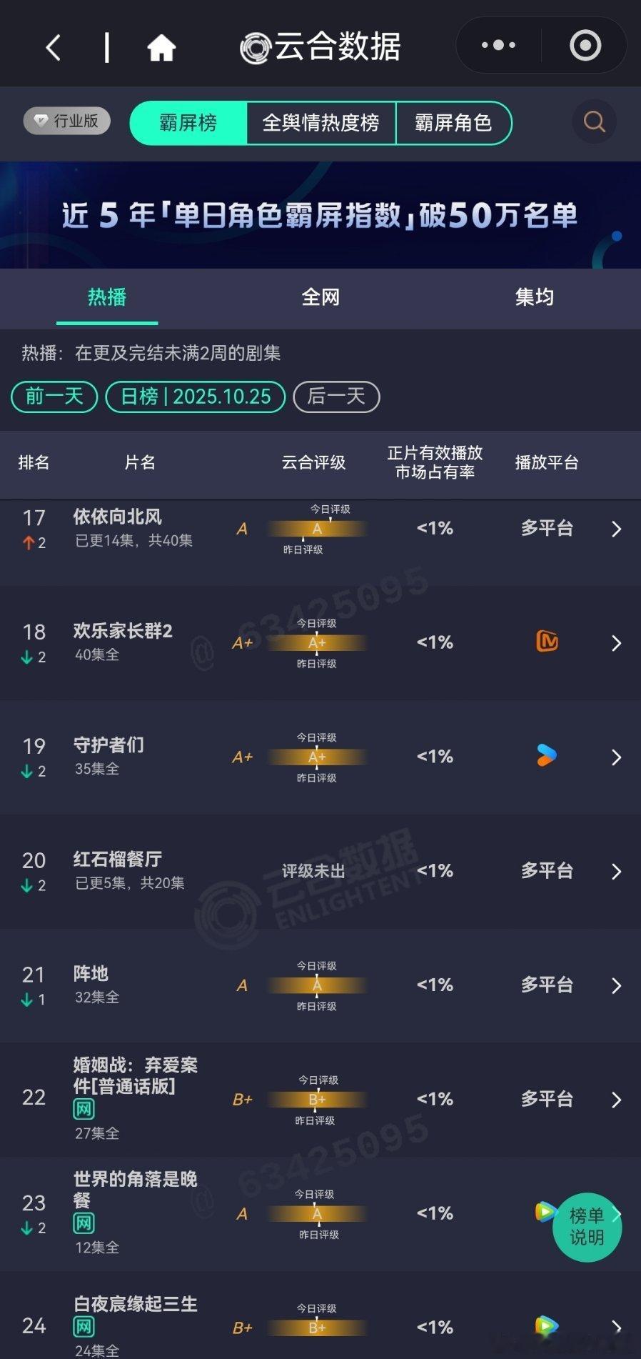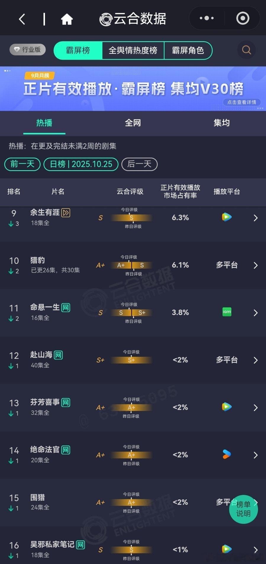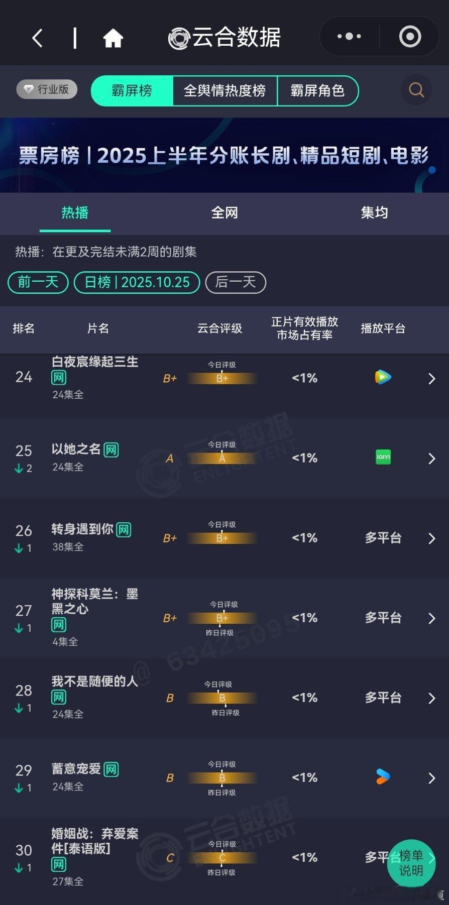 10月25日云合播放占比云合