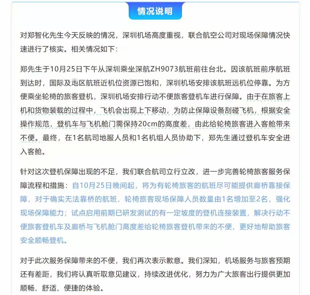 近日,郑智化发文吐槽深圳机场没有人性,升降车与机门地板有25厘米落差,轮椅无法直接推进飞机,而他又无法直接迈进机门,因此他抱怨升降车操作员无动于衷,导致自己“连滚带爬”才进飞机! 看了深圳机场的道歉声明,我觉得有理有据,可以接受,机场的这次公关堪称完美。 声明解释了现场出现的情况,郑智化所说的25厘米高低落差,属于国际惯例。 现场地勤人员和机组人员也帮助他顺利登机,并没有出现狼狈不堪的情况。 机场也表示会整改,而且公布了具体措施,包括增加服务人员和使用斜坡连接设备。 看来郑智化也接受了这份充满诚意的致歉声明。 不过也有网友吐槽郑智化有点夸大事实。 对此您怎么看?