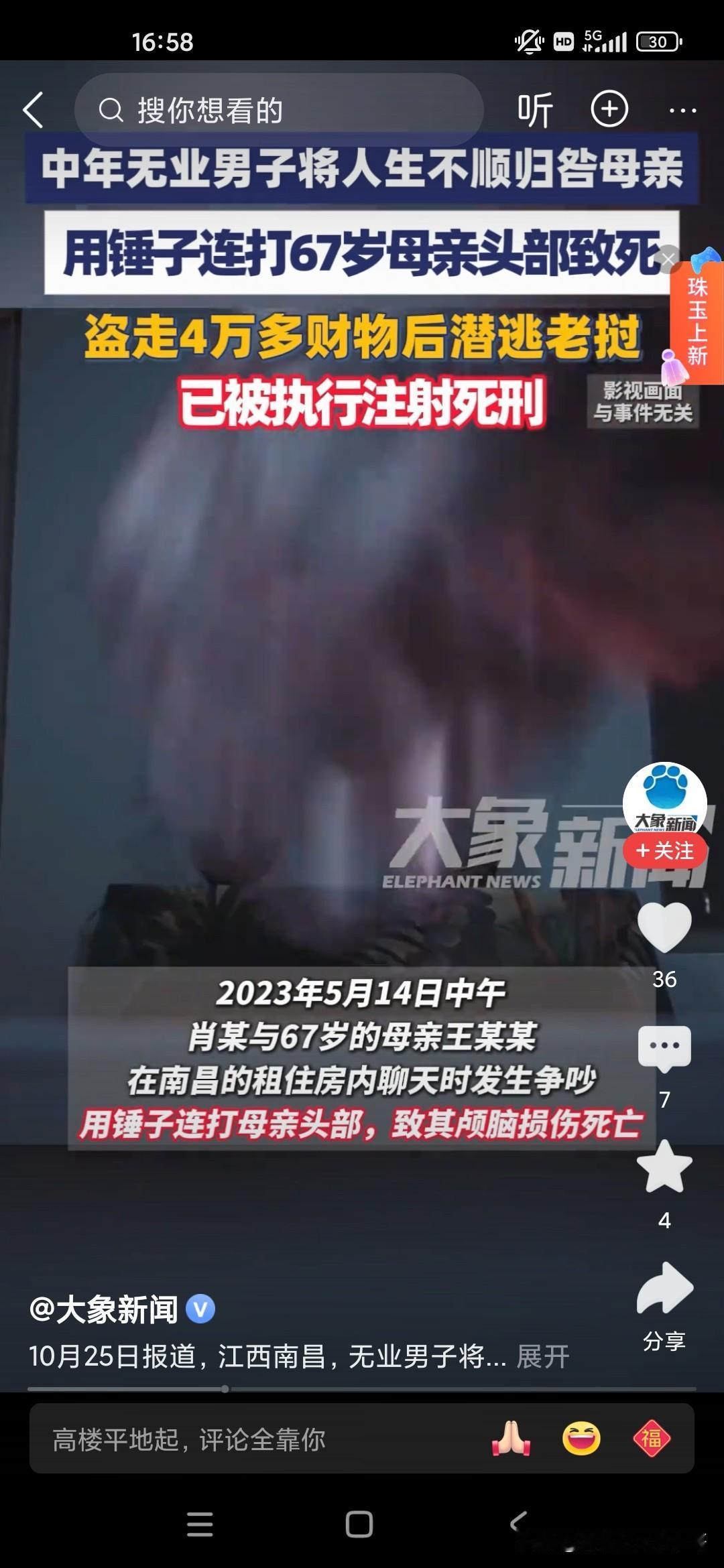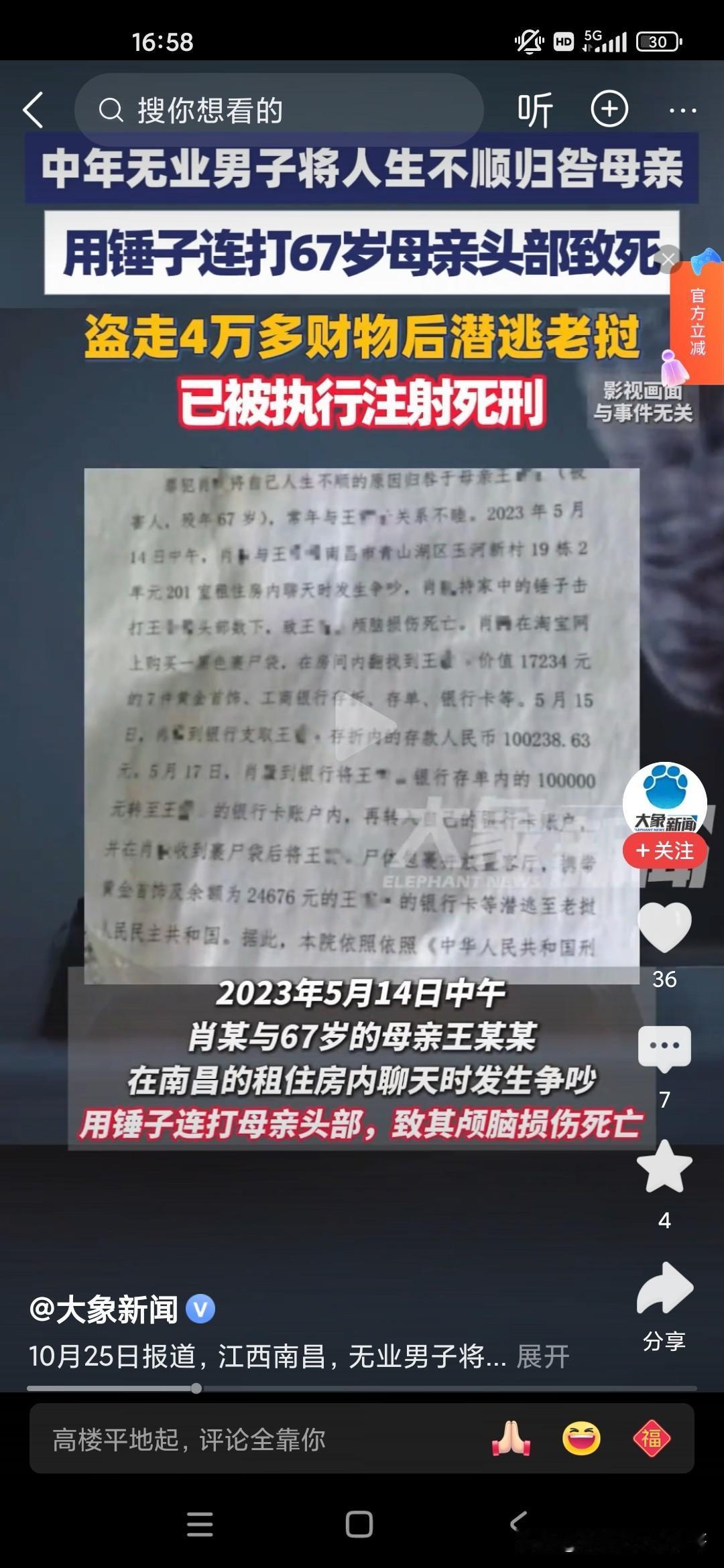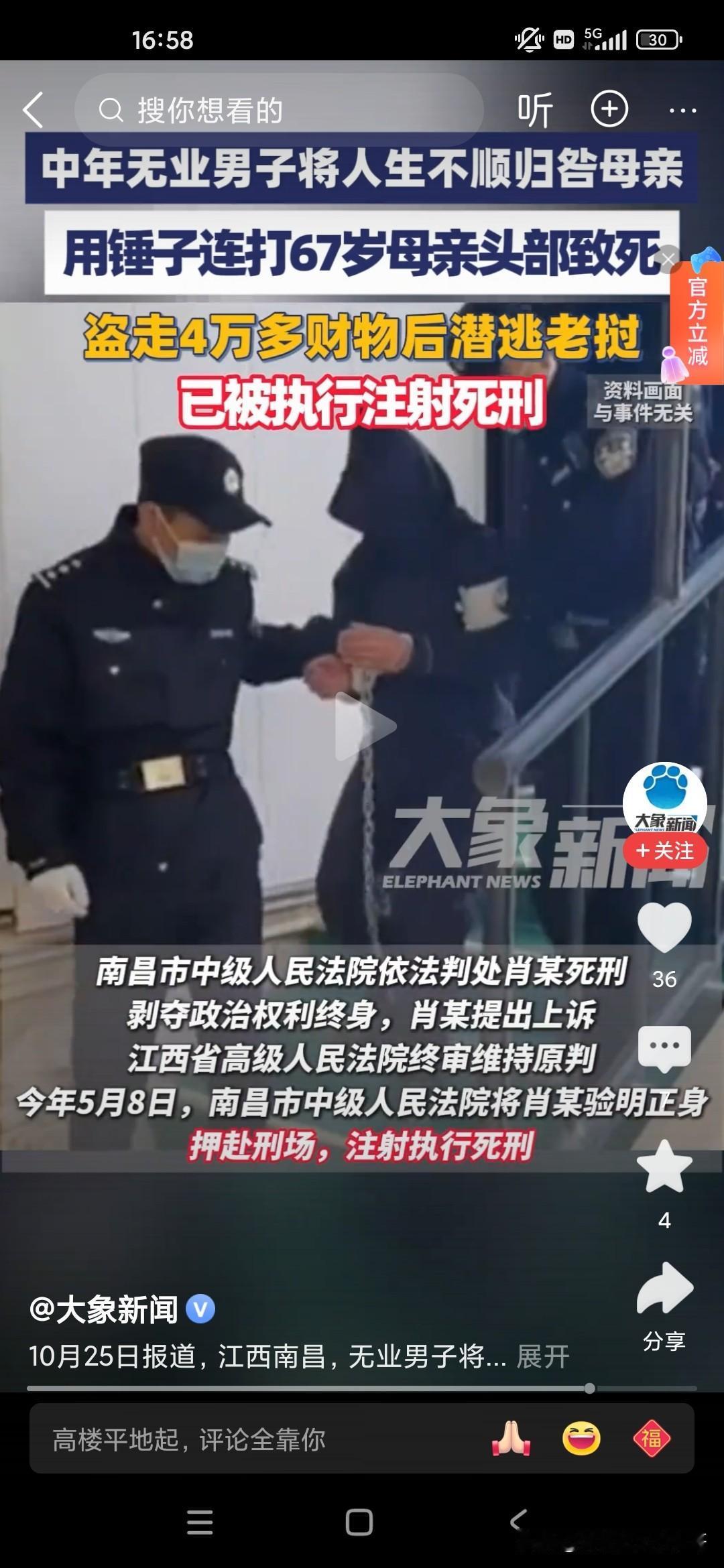虎毒尚且不食子,不知道这名男子到底是不是不是人,还是冷血动物,竟然用锤子把自己的母亲给打死了,目前南昌市中级人民法院判处该名男子死刑,剥夺政治权利终身。这名男子的话是因为工作方面的原因,最后失业了,失业之后的话心情非常郁闷,然后就和自己的母亲因为琐事吵了起来,在争吵的过程中,可能母亲也指责他整天无所事事,只是待在家里没有任何作为,所以说他母亲可能言语上有点过激,这名男子气不过觉得自己啊40多岁的人了,在外边本来都受别人歧视了,想不到到家里还是还这么受人不待见,所以说他就很生气,就直接拿到身边的锤子,然后不顾一切的砸他的母亲脑袋,后来自己还买了裹尸袋,把他母亲的尸体藏了起来,然后自己就把他母亲的存款全部取出来,金银首饰全部卖掉,后来逃到了老挝,后来才引渡回国,像这种丧心病狂的没有人性的家伙,绝对要实行死刑或者凌迟处死才比较解恨!