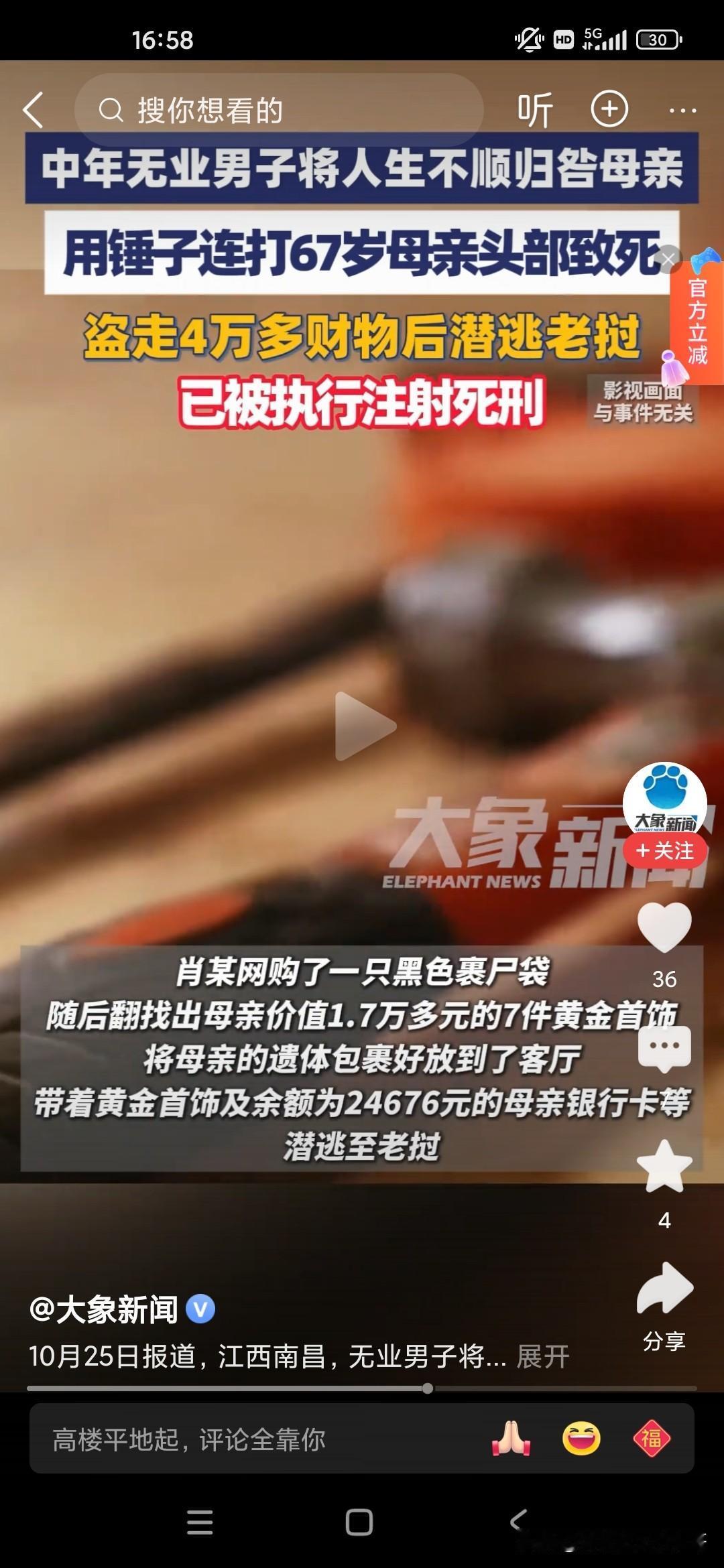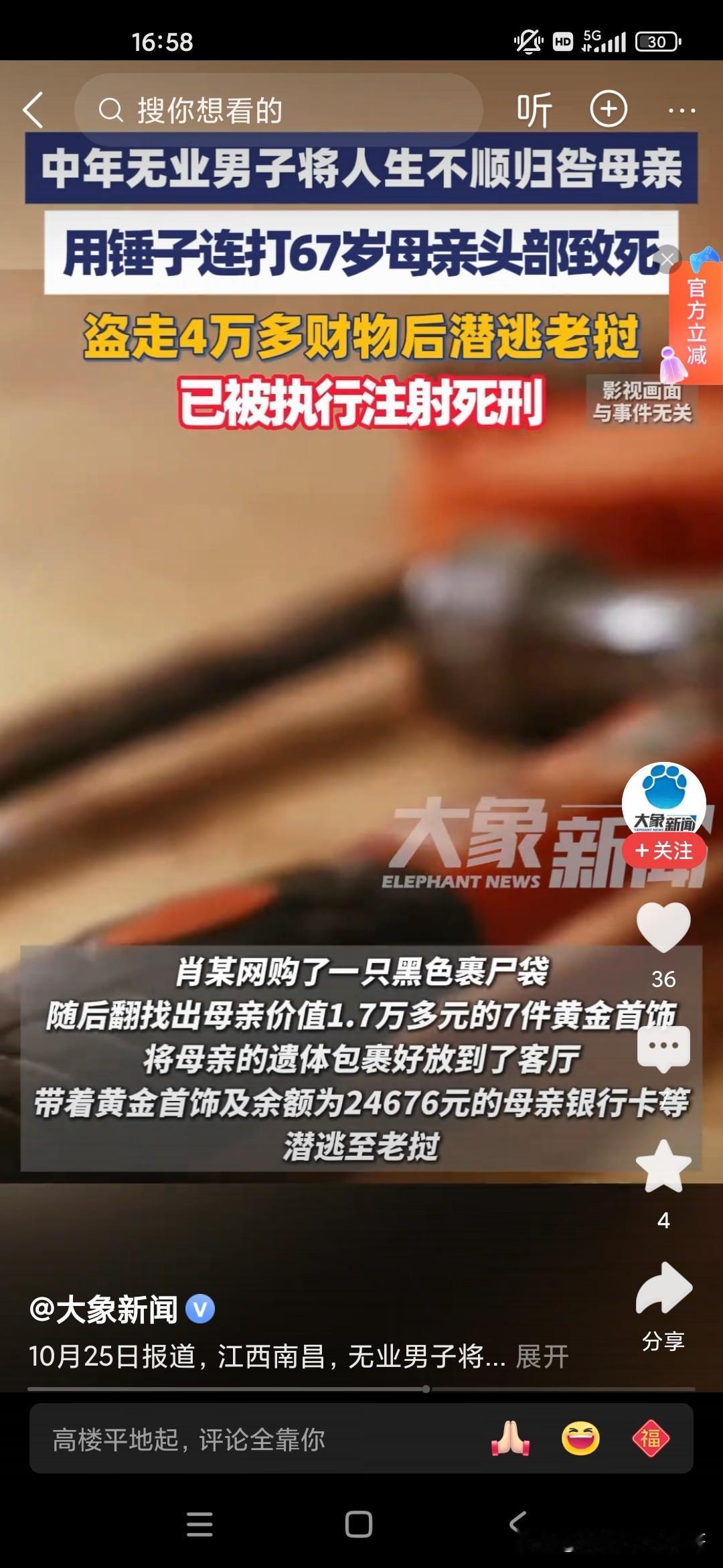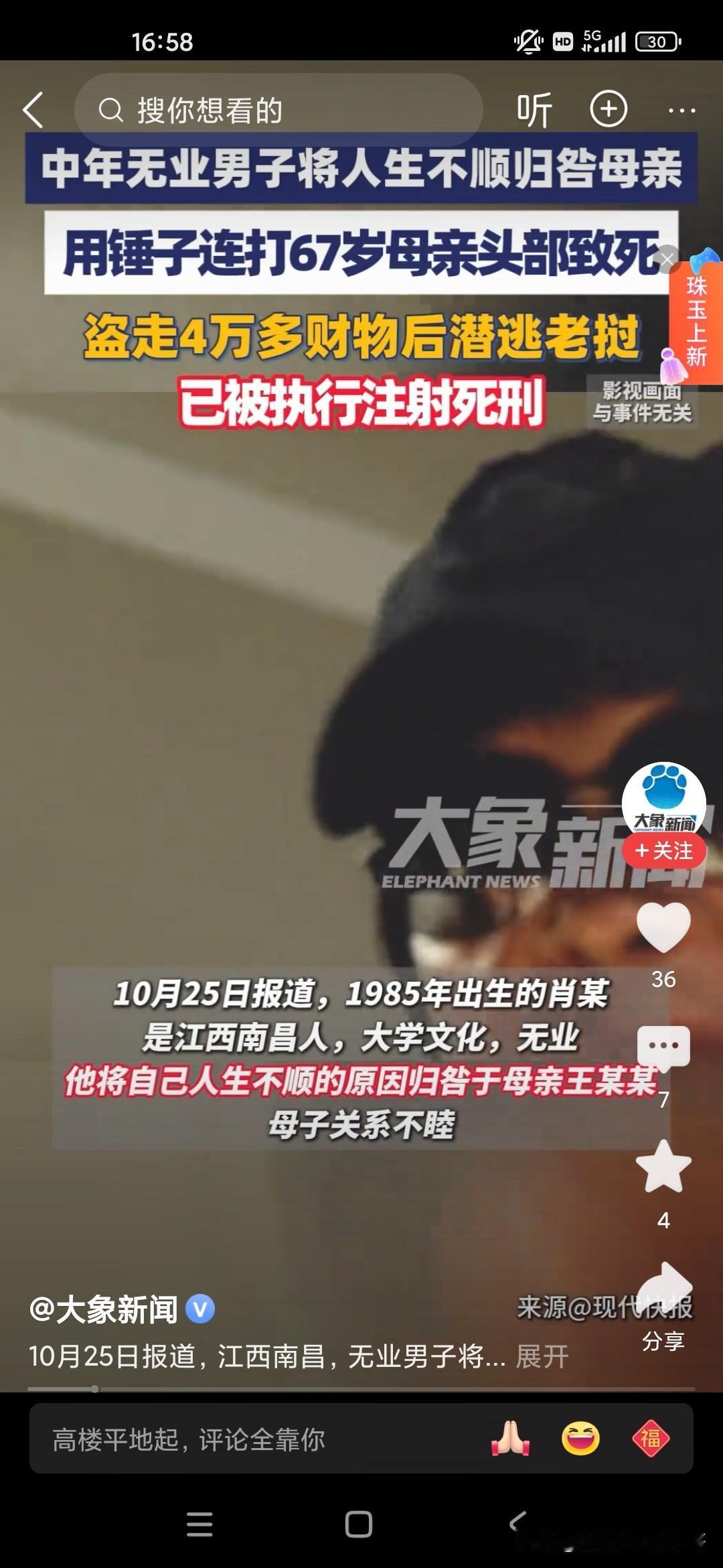 虎毒尚且不食子,不知道这名男子到底是不是不是人,还是冷血动物,竟然用锤子把自己的母亲给打死了,目前南昌市中级人民法院判处该名男子死刑,剥夺政治权利终身。这名男子的话是因为工作方面的原因,最后失业了,失业之后的话心情非常郁闷,然后就和自己的母亲因为琐事吵了起来,在争吵的过程中,可能母亲也指责他整天无所事事,只是待在家里没有任何作为,所以说他母亲可能言语上有点过激,这名男子气不过觉得自己啊40多岁的人了,在外边本来都受别人歧视了,想不到到家里还是还这么受人不待见,所以说他就很生气,就直接拿到身边的锤子,然后不顾一切的砸他的母亲脑袋,后来自己还买了裹尸袋,把他母亲的尸体藏了起来,然后自己就把他母亲的存款全部取出来,金银首饰全部卖掉,后来逃到了老挝,后来才引渡回国,像这种丧心病狂的没有人性的家伙,绝对要实行死刑或者凌迟处死才比较解恨!