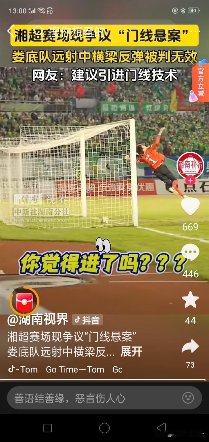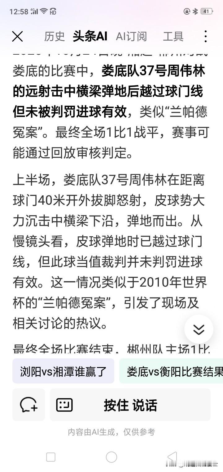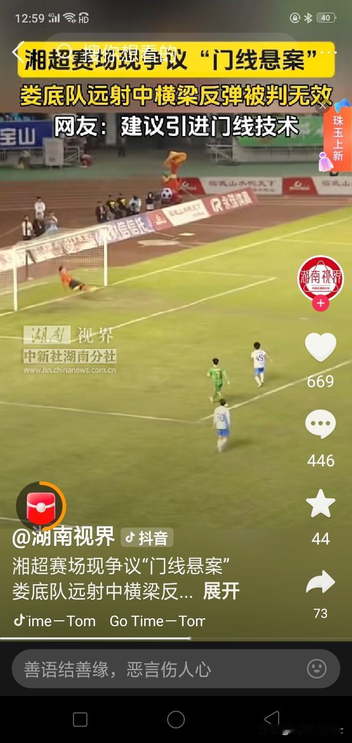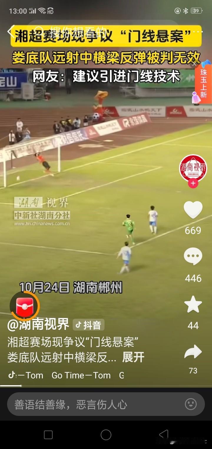 足球比赛中的″兰帕德冤案″,应不应该发生在湘超的比赛中? 在10月25日湘超第七轮比赛中的郴州VS娄底比赛现场,就发生了″兰帕德冤案″式的周伟林冤案! 该场比赛的上半场进入到20分钟左右时,娄底队37号周伟林在距离球门40米开外处,一脚发怒远射,饱含惊天动地的世界波巨力,势大力沉的足球击中郴州队球门横梁下方,进入球网,落地后反弹而出,当值裁判误以为此球未进球门,没有将此球判为进球。 电视直播回放此球时,足球落地至少在球门线以内20厘米以上,明显不是落在球门线上,连现场解说员都在大喊进球了,进球了!但此球却一直没有得到裁判们的纠错,以至引发了现场球迷们的热议和争论,特别是引发娄底到现场观看球赛的球迷们抗议,一直到凌晨都不肯离开现场,要求给一个公正性答复。 此事迅速在网络上引起广泛讨论和关注!有的认为,湘超是娱乐性活动,没必要较真;有的认为,裁判是法,必须尊重裁判,裁判说啥就是啥,冤枉都合法;有的认为,湘超没有引进VAR技术,误判错判在所难免;有的认为,湘超没有申述制,就是为了给裁判提供国足式的漏洞等等。 在正规足球比赛中,使用VAR技术,目的是通过视频回放辅助裁判更准确地判罚进球、禁区内事件、红牌及误认球员等情况,减少错判误判漏判,提升比赛的公正性。 笔者认为,湘超虽然不是正规的足球专业比赛,属于文娱性业余赛事活动,但该要的规矩还是必须要的,观众可以包容踢球水平的高低,但不会容忍比赛不守规矩,不会容忍知错不改和知错不纠! 进入视频时代以来,连考公考编等等各种面试,都早已实现从同步录像录音到现场直播式的360度视频监控监督,并建立健全了申诉上诉制度。湘超的每一场比赛,都有电视直播、网络直播、手机直播、APP等等各种直播,因此对湘超比赛中每一场有争议或分歧的地方,完全可以通过视频回放的方式,还事实于真相,没有错判误判的坚决维持原判,若有错判误判予以及时纠正即可,就可以从根本上维护比赛的公正性。 ″兰帕德冤案″促进了国际足球比赛裁判制度大完善,我们不希望进入视频时代的湘超比赛,还会发生周伟林冤案,更希望湘超不要借口没有ⅤAR技术,就可以不矫枉纠正!湘超足球赛 湘超郴州队 娄底足球队