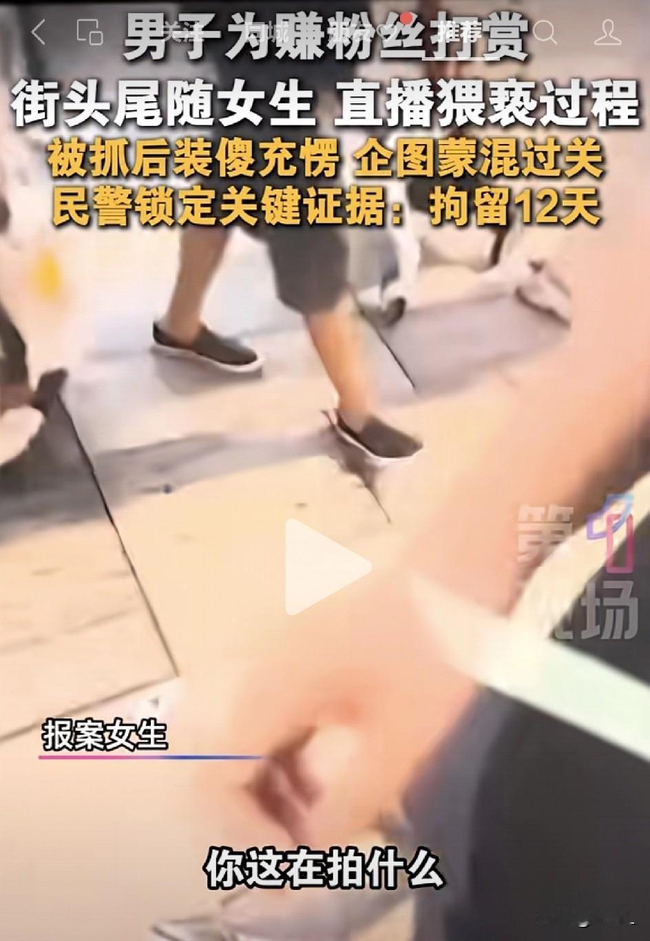 直播猥亵,证据确凿,只拘12天?公众怒吼:犯罪成本太低了!当街头猥亵成为“直播赛道”,谁还敢说安全感? 10月25日,湖南长沙解放西路上,一名男子在街头直播时,尾随两名女生。 为了获得粉丝打赏,在某些心思阴暗的粉丝怂恿下,男子趁着人群密集时,用下身撞击女性,直播猥亵行为,来满足某些人的低级恶趣味。 被猥亵的女生察觉后立即报警,并指出男子全程直播记录。 男子的猥亵行为被自己的直播记录的清清楚楚、明明白白,证据确凿。 男子被抓以后,以自己是“接受粉丝抽象挑战”为由,为自己诡辩。并且在警局内仍不配合,行为轻浮。 最终男子因违反《治安管理处罚法》,被依法处以行政拘留12日。 但公众对拘留12天的处罚,明显不买账,纷纷认为这样的犯罪成本太低,应该立法针对这样的网络低俗直播和违法行为加大处罚力度。 “12天太少。至少三个月甚至半年。” “把提出这个任务的人一起抓起来!” “这是群体组织猥亵案!” “就因为只有12天!所以他就开始了这个赛道的直播。” “12天太少了,这是在直播啊!” “建议对此人全平台永久性封号,并将直播间起哄的一起处理封号。” “打赏的也是从犯,法律应该与时俱进了。” “建议查查手机群聊,肯定有群!” “还有那批直播护送女子回家的,也一并处罚了!” “平台监管不到位也要处罚!” “直播收益对比收到的惩罚这简直微乎其微。” “罚太轻了吧!” “直播猥亵应该比一般猥亵情节更重吧,毕竟是造成社会不良影响!” 全民自媒体时代,言论自由,但并不代表可以无法无天、毫无底线! 生而为人,就应当有接受人类社会约束的觉悟。既然选择了当人,就不要行chu sheng不如的行为。 当有人说,给这个人zha记录案底,让他的子女彻底断了考公考编的路途。 有网友只用了短短几个字来回复,铿锵有力:“他不配有子女!” 大家说的很对,这种直播猥亵的性质太过恶劣,绝对不应该是仅仅12天的拘留完事,必须严惩严判! 还有那些煽风点火,怂恿男子去猥亵的所谓粉丝们,也应该立法惩治。就比如有人要跳楼,底下有人起哄,喊“要跳赶紧跳!” 这些人或许没有直接犯罪,但他们有一颗犯罪的心,并通过自己的语言和行为,去影响、教唆别人犯罪,来满足自己扭曲的心理。 他们比直接犯罪的更可恶、更阴险狡诈、更应该接受惩罚! 还有流量至上的平台,亦难辞监管失察之责。大数据监管下的平台,不可能监察不到男子此类的不良直播,但追求流量、追求利益的平台,选择了睁一只眼闭一只眼,闷声跟着发财! 这样的平台,这样的所谓主播,还有一群心眼肮脏的网络蛀虫,当罚则罚,而且要从严从重! 只有让违法者付出承受不起的代价,让教唆者无处遁形,让平台不敢失职,才能从根本上遏制这类“chu sheng不如”的行为,还网络空间以清朗,护公众身心以安全。 信息来源于第一现场,侵联删!