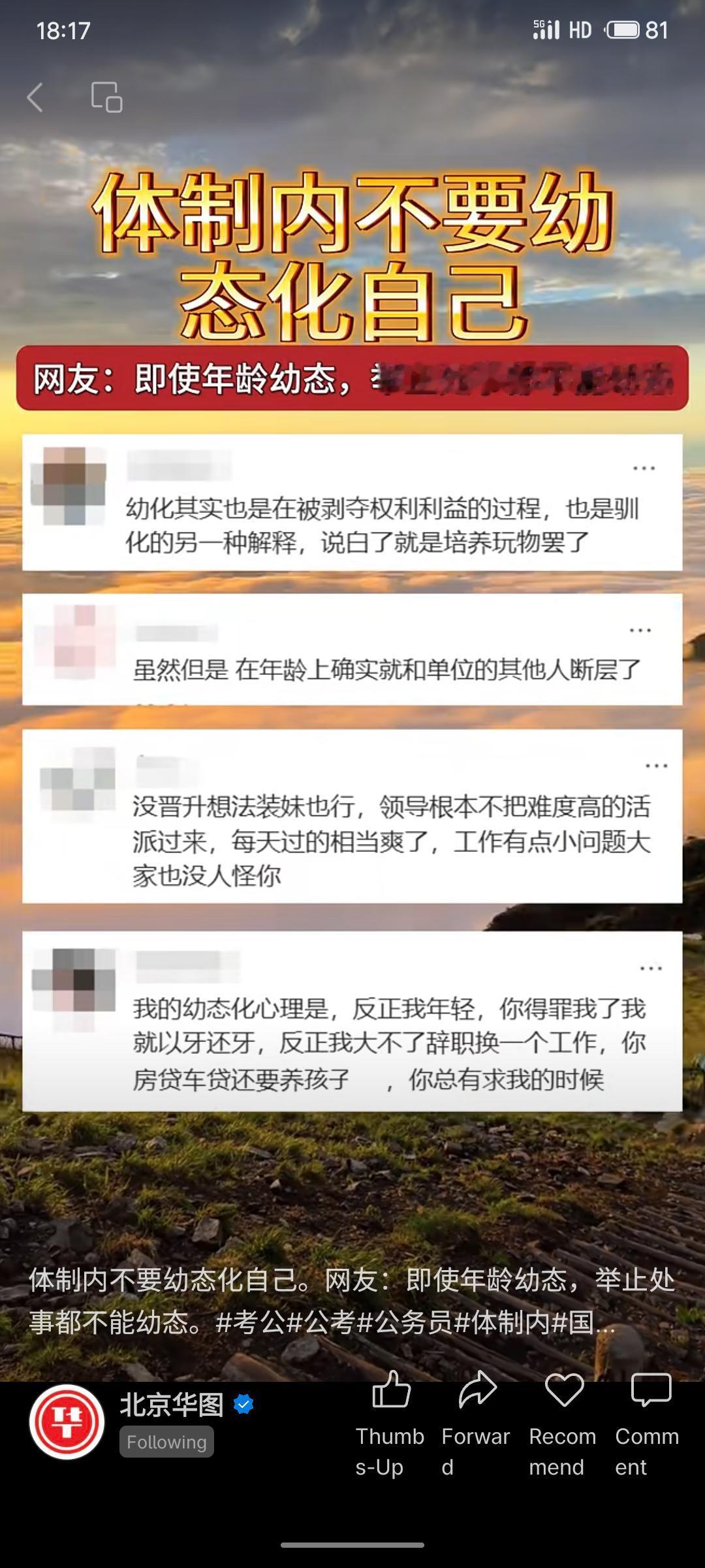 讨论体制内“幼态化”现象。有观点认为,举止应成熟稳重;也有人借“幼态”躲避重任或持“年轻无畏”心态应对职场矛盾。观点多元,反映不同职场生存策略。