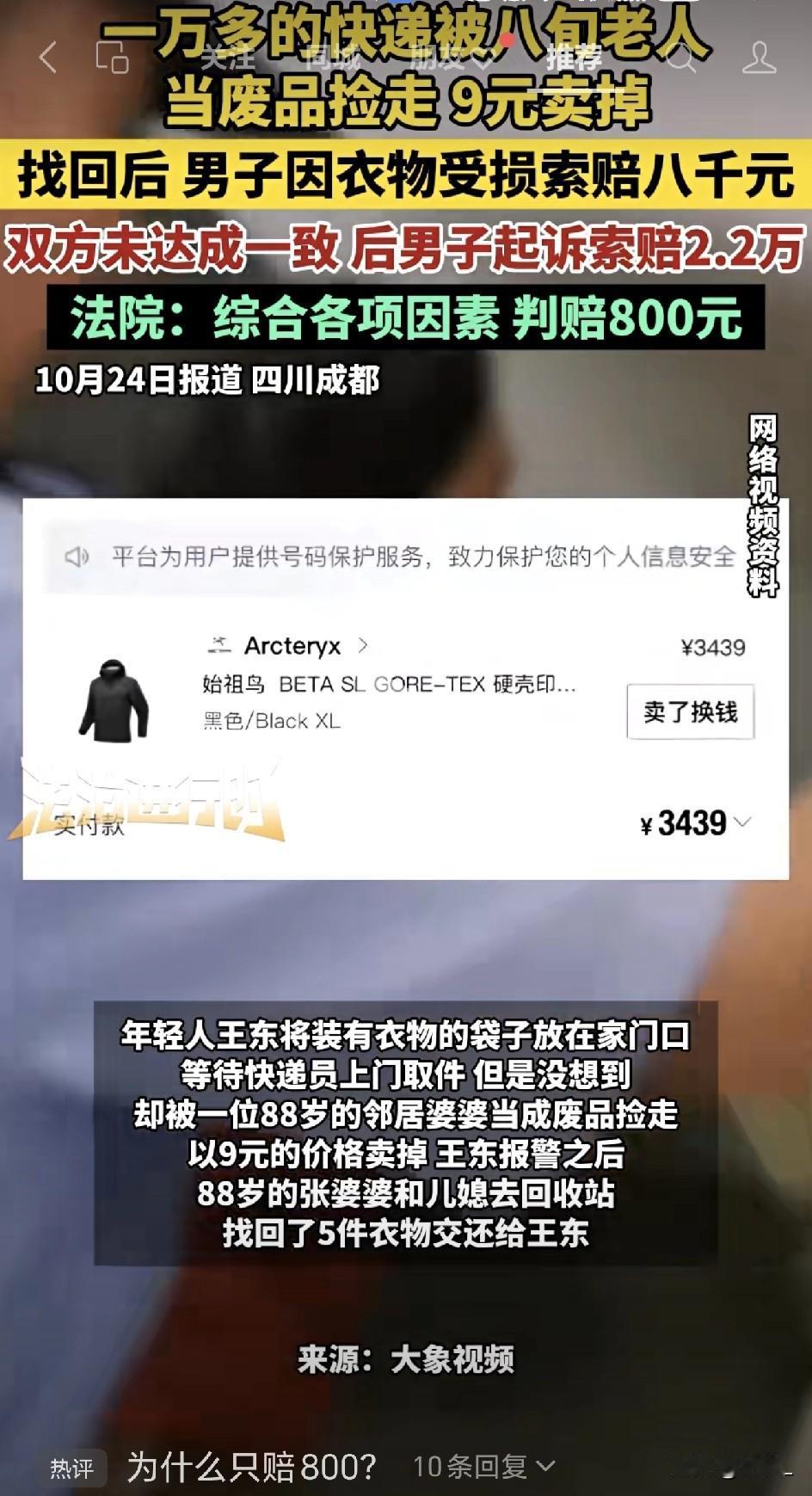 万元衣物被婆婆当废品卖了9块钱!索赔两万二,法院一锤定音:赔800!失主收到转账时,肠子是否悔青? 四川成都,一年轻人王东,将一袋装有衣物的袋子放到了自家门口,等待快递小哥上门取件。 没想到的是,还没等来快递小哥,却等来了一位八旬婆婆。 88岁的婆婆看到王东门口的这袋衣服,以为是废品,就捡走拿去卖废品,挣了9元钱。 王东报警后,88岁的婆婆和自己的儿媳妇李芳一起去废品回收站,找回了包括始祖鸟冲锋衣和冲锋裤在内的5件衣物交还给王东。 王东认为这5件衣服均有不同程度的受损,自己当初购买时花了一万多,所以要求婆婆赔偿8000元。 婆婆一家觉着8000元的赔偿太贵,愿意赔偿5500元。 这个金额,王东又不满意,双方无法达成一致。王东将对方起诉至双流区人民法院,要求赔偿财物损失、精神损害抚慰金、误工取证费等费用共计22530.9元。 法院的判决,也着实惊了双方的下巴! 法院综合衣物购买时间、使用情况等因素,判婆婆赔偿王东财物损失800元。 在收到法院的判决书后,李芳于9月26日将法院规定的赔偿金额以微信转账的方式转给了王东。 不知道当时的王东是不是肠子都悔青了? 而评论区里的网友们,议论最多的还是88岁的婆婆: “不问自取视为偷。不管多大岁数!” “她是老人不是小孩,越老越有社会经验更知道什么事不可以做。” “这哪是捡废品啊,就是偷盗。” “现在的老人就应该惩罚一下。谁家门口的东西他都敢捡。也不管里边装的是啥。” “典型的盗窃行为,为什么只赔800,让她子女赔,这是个态度问题!” “凭什么只赔800?” 就像有网友所言,男的也有问题。 他的衣物起初购买的时候或许一万多块,但衣物现在已经属于二手物品,在要求赔偿时,应该充分考虑折旧问题。 要求赔偿是正常的,但赔偿金额应该是一个合理的金额,毕竟衣服已经还回来了。 法律支持维权,但更守护公平。 大家对这件事怎么看?欢迎来评论区聊一聊! 信息来源于法治进行时,侵联删!