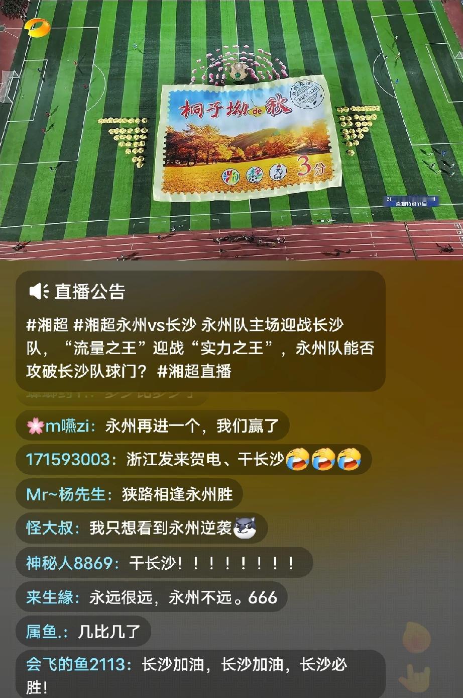 “桐子坳的秋”,这是什么梗,有没有网友能出来解释一下? 湘超永州vs长沙的比赛,又被称为“流量之王”和“实力之王”之间的比拼。目前,上半场比赛战罢,永州1:0暂时领先。谁能想到,第一个攻破长沙大门的会是这个球场都是临时搭起来的永州。 1:0这样的比分,其他十二个充电宝应该都是乐见其成的,因为十三个充电宝真的苦长沙这个“长期吸”久矣! 长沙此前六轮比赛一球未丢,现在上半场就比分落后了,不知道会不会打击到他们的信心! 现在终于看到挂票了,而且还是个女球迷[我想静静][我想静静][我想静静]