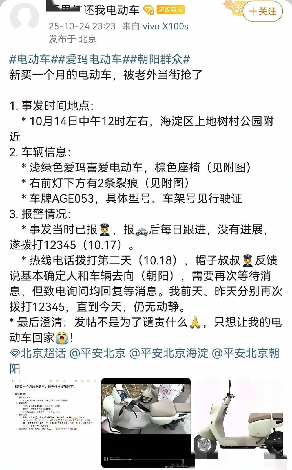 咱国人是不是被保护的太好了,都这么单纯善良!有个妹子发帖说在北京街上碰到个老外,那老外说想试试她的电动车,妹子心大呀,想着应该没啥事就答应了,结果那老外骑上就头也不回地跑了。 这妹子肯定特后悔,本来好心,结果让人给坑了,只能等帽子叔叔帮忙找了。咱平时对人友善是好事,可也得有点防人之心啊,不能谁的话都信。 不过这也提醒咱们,不管啥时候,都得留个心眼。出门在外,自己的东西得看好,可别像这妹子一样吃了亏才知道后悔。大家身边有没有遇到过这种因为太善良、太相信人结果吃亏的事儿呀?快来评论区说说社会现象