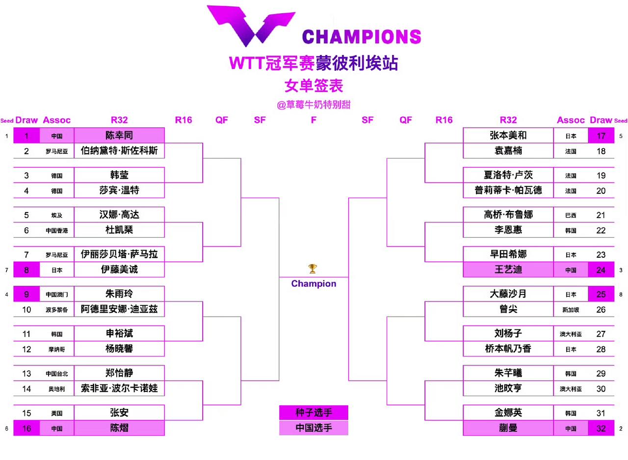 蒙彼利埃冠军赛签表首轮就有7组内战,真的是还蛮震惊的。 这确认是洗开了吗,女单两组内战,这还是正常数据。 男单5组,日韩法德瑞,每一个协会一个内战, 也是很平均的, 这是第一轮就要互撕,然后撕回去一个的意思呗。 国乒女单的签位还算正常, 大家各守一个1/4区,然后争取都会师。 男单的签位也还好, 只是首轮的对手,都不好打, 一定一定要首轮打好啊, 咱们这么远过去挺不容易的。 多坚持几轮,加油加油。