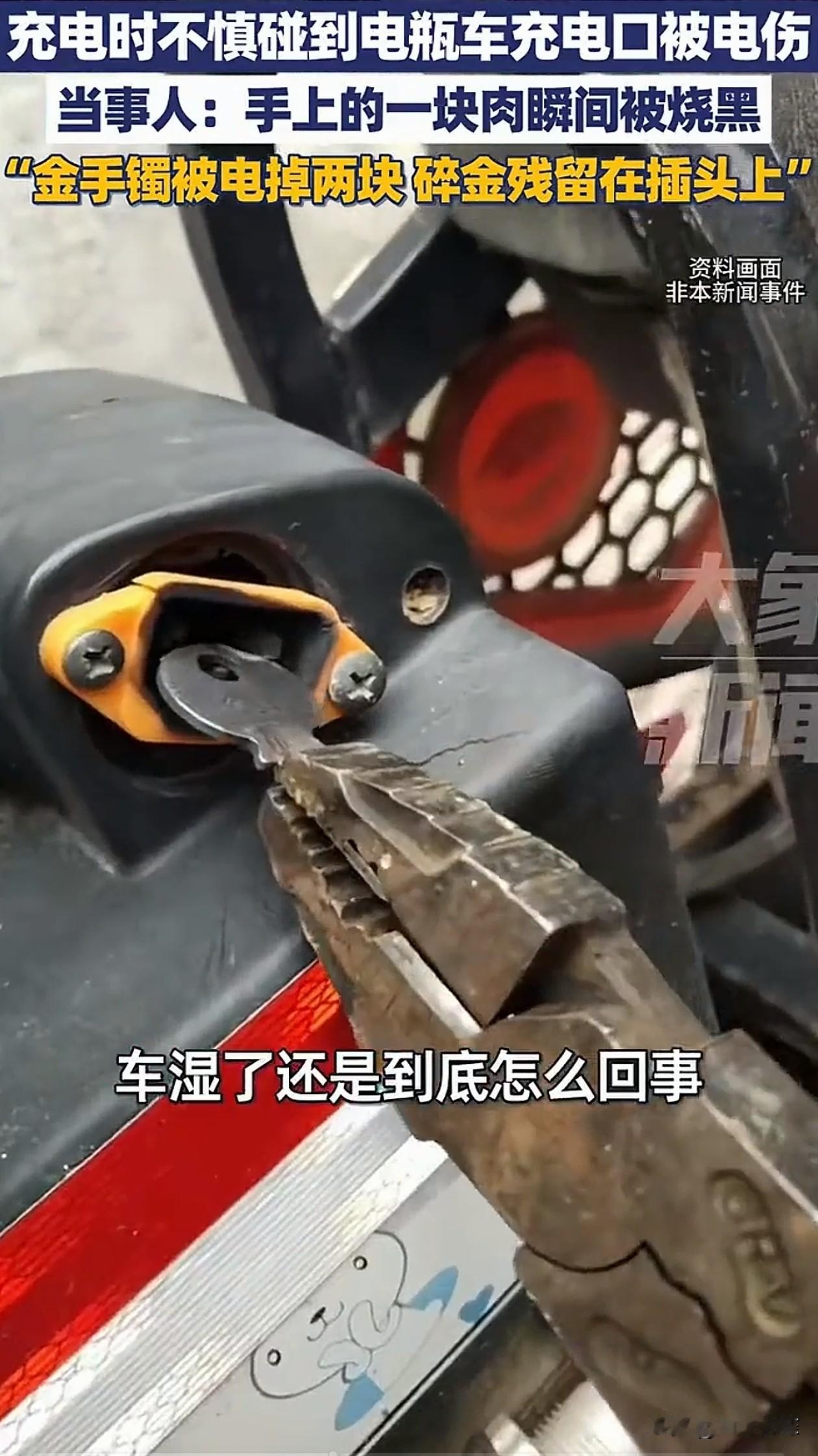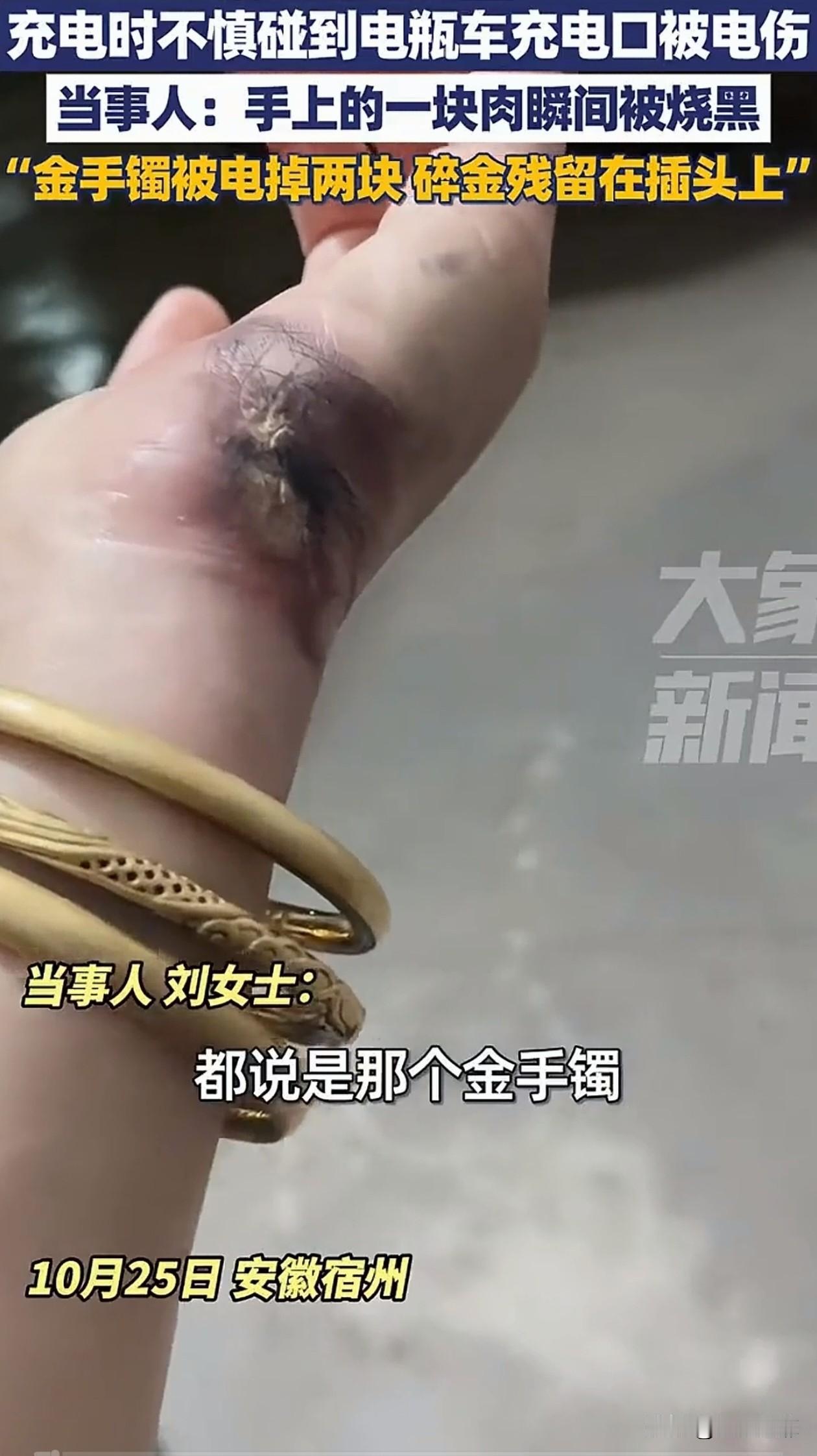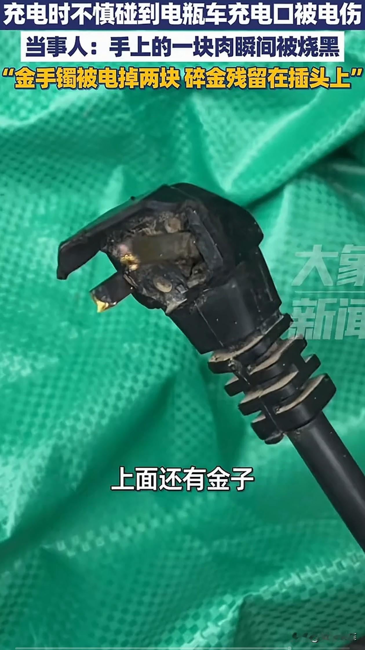 女子充电时,不小心碰到了电瓶车充电口被电伤,金手镯也被电掉两块,碎金残留在插头上。当事人:手上的一块肉瞬间被烧黑。 安徽,女子正掰开充电口盖子准备充电时,手指刚碰到盖子,瞬间被电,右手食指尖烧得发黑,一块肉被烧焦。 她手腕上的金手镯,也直接缺了两块,掉在地上的碎片还带着焦痕,表面坑坑洼洼的。 女子说,事发前一晚下过雨,车辆是湿的,她不确定是雨水导致的短路还是充电口本身有问题。 女子手上的伤只能慢慢修养,她的镯子是彻底修不好了,只能融了重打,里外损失小一万块。 目前,她已经联系了电动车售后,对方会派人来检查充电口,赔偿的事还在协商。 女子的遭遇让人心疼,她只是正常去给电动车充电,却发生了这样的意外,身体和财产都受到了不小的损失。 给电动车充电时千万别碰充电口,尤其雨天要把充电设备遮好,定期检查电池和充电线有没有破损,发现老化就得赶紧换。 女子也表示,希望自己的经历能提醒大家,充电前多检查一秒,可能就少一分危险。