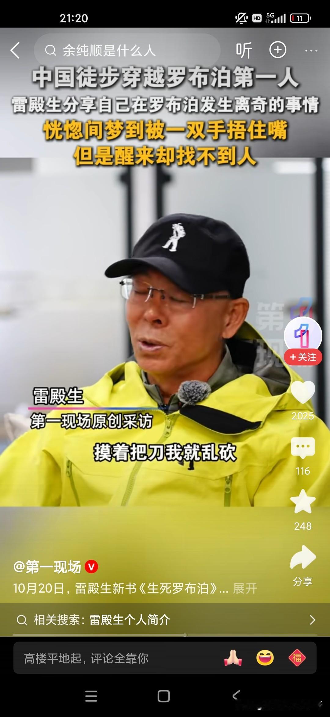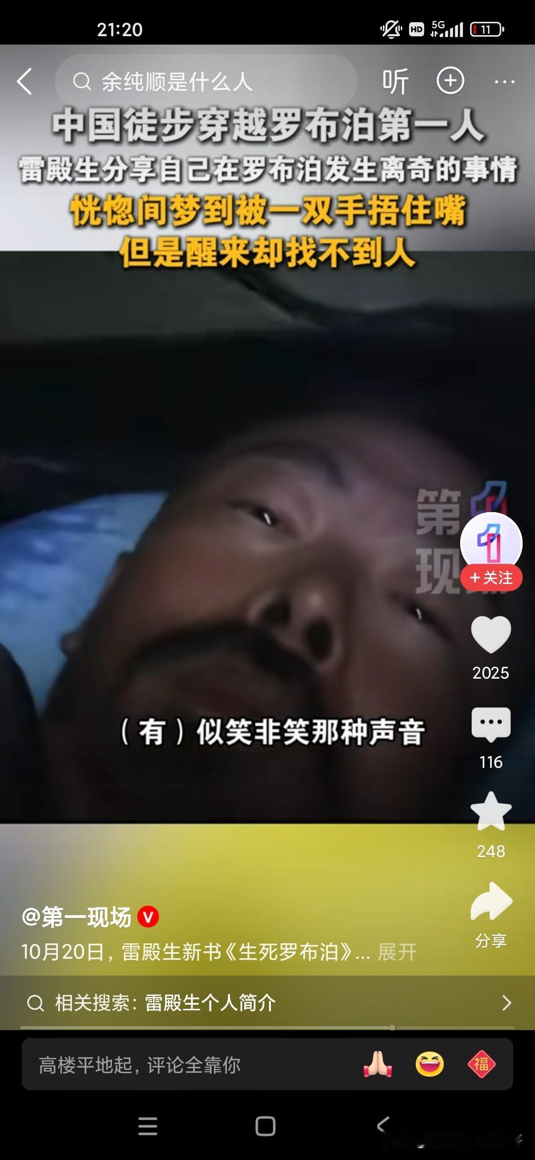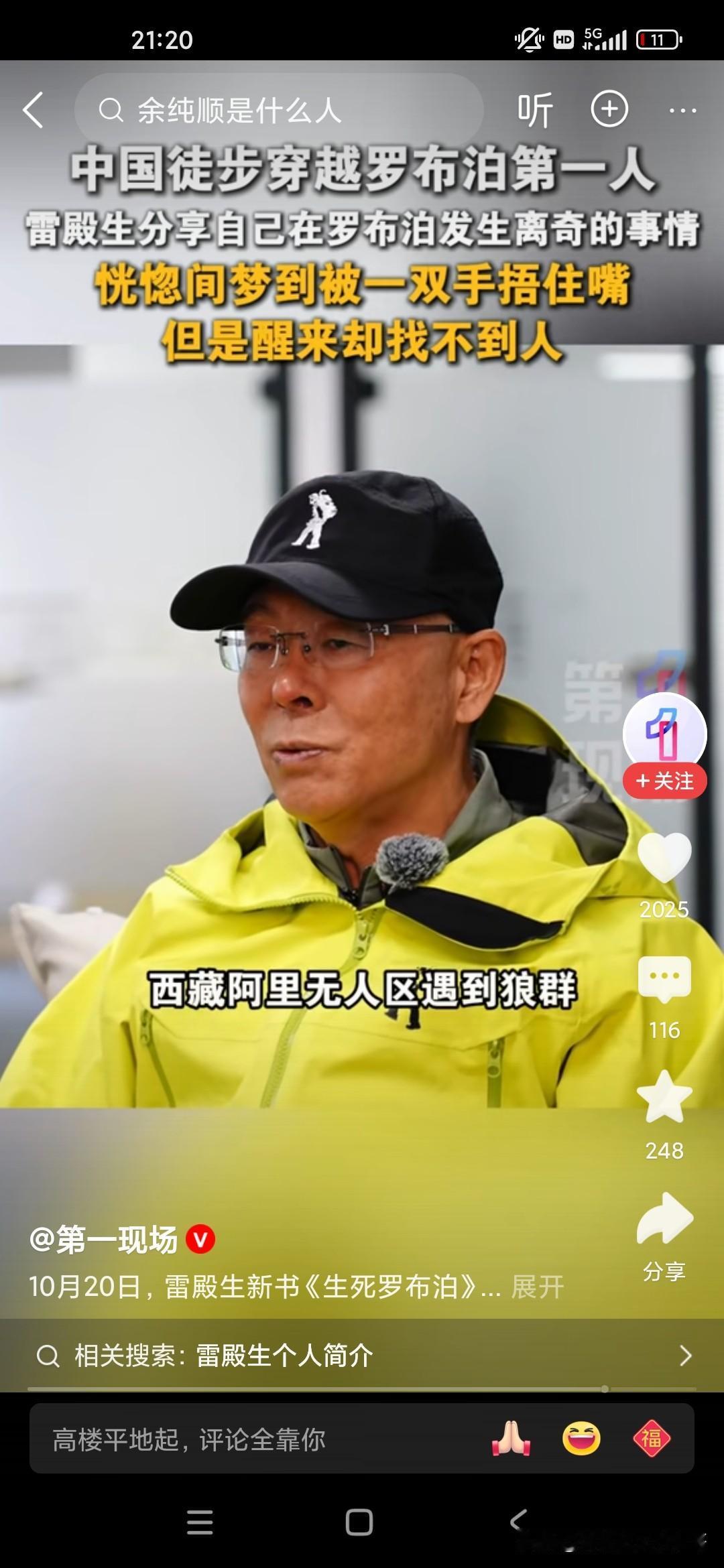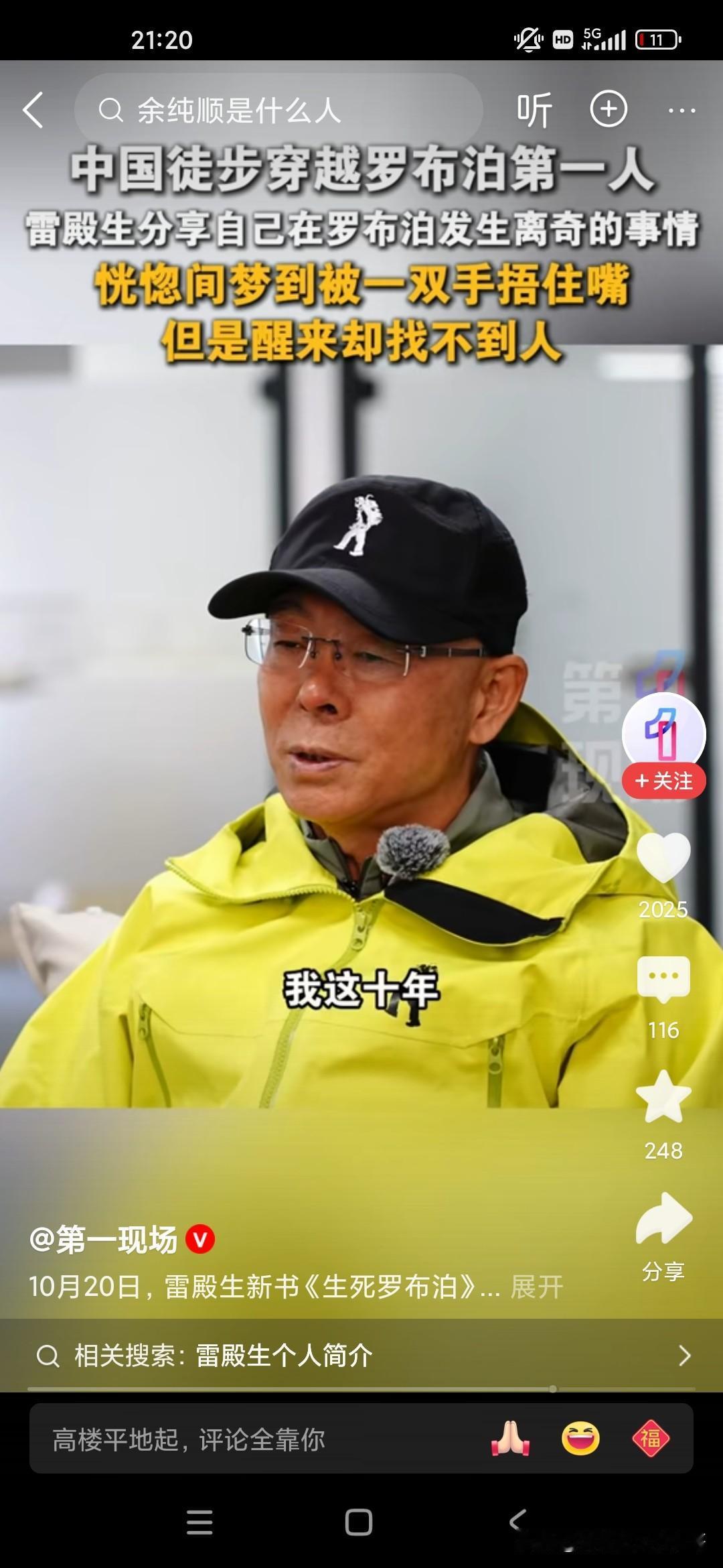 雷电生也真是狠人呐,自己徒步了中国边境线包括一些比较偏远的原始森林,或者说是山区呀,超过100000km,而且奇迹般的生存了下来,他说有两次他不敢睡觉,在其他地区基本上都可以睡得很香,第一个是西藏阿里地区遇到狼群的攻击,晚上手中始终攥着刀,一直不敢睡觉,第二的话是在罗布泊余纯顺的墓地周围,当时是自己搭了帐篷,晚上感觉到一个黑影蒙住了他的脸,掐住了他的脖子,他就呼吸不上气来,然后他自己拿着刀啊,狂乱挥舞,结果有一个黑影就从他那个帐篷里出去了,12点之后的话他再也不敢睡觉了,直到第二天天明他才敢出发,他说的感觉是真实的,但是一切都说不清楚,现在回忆起来他仍然心有余悸不是!