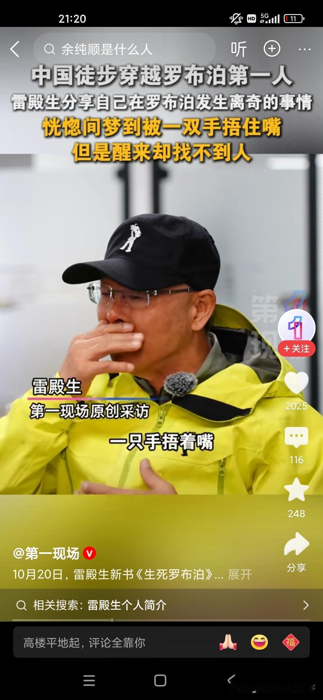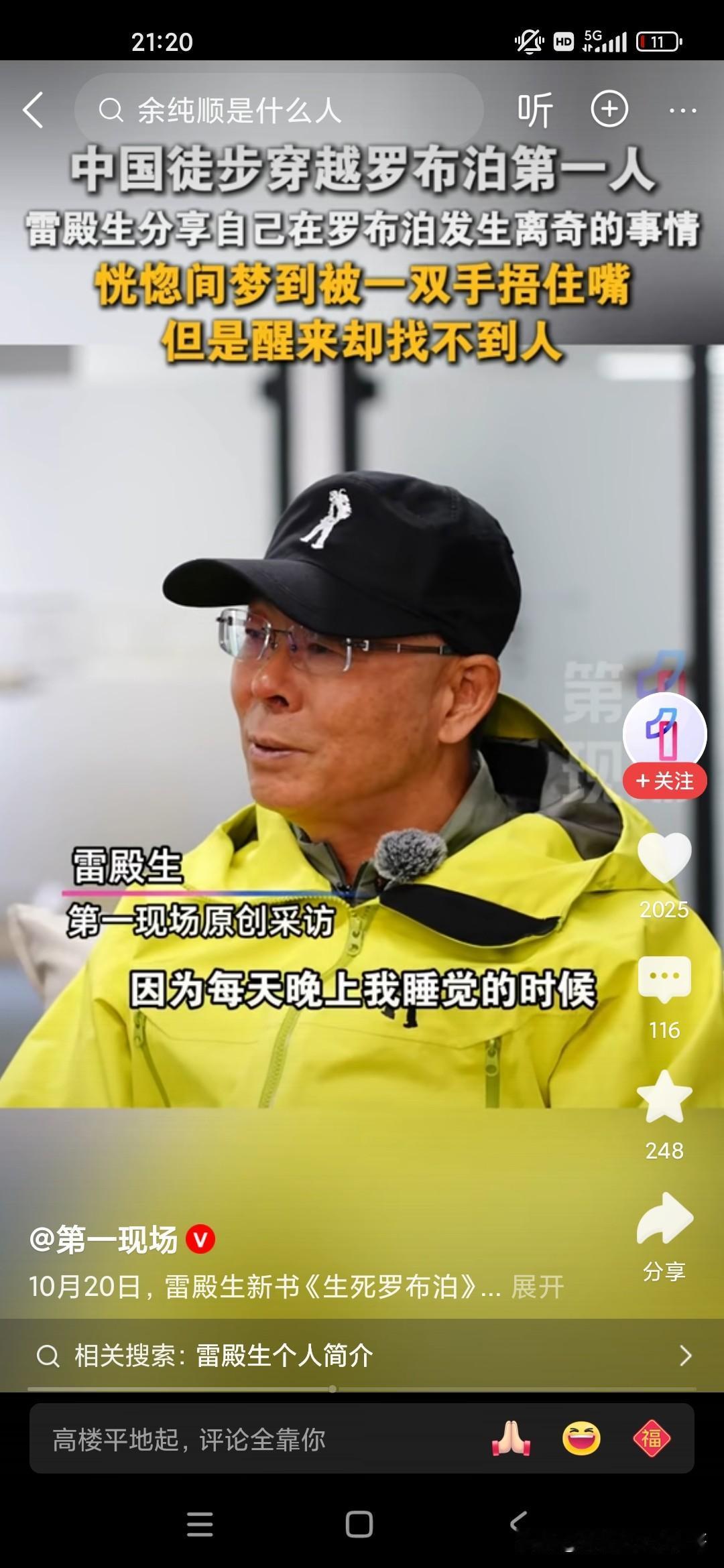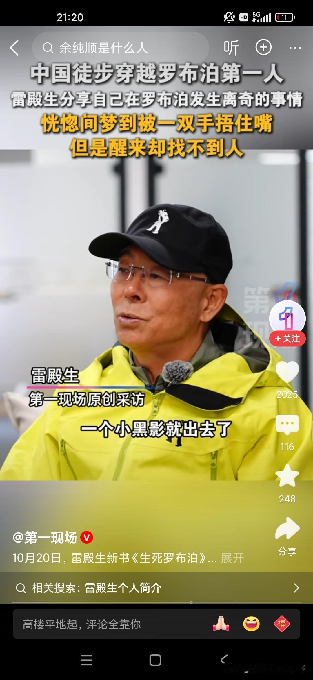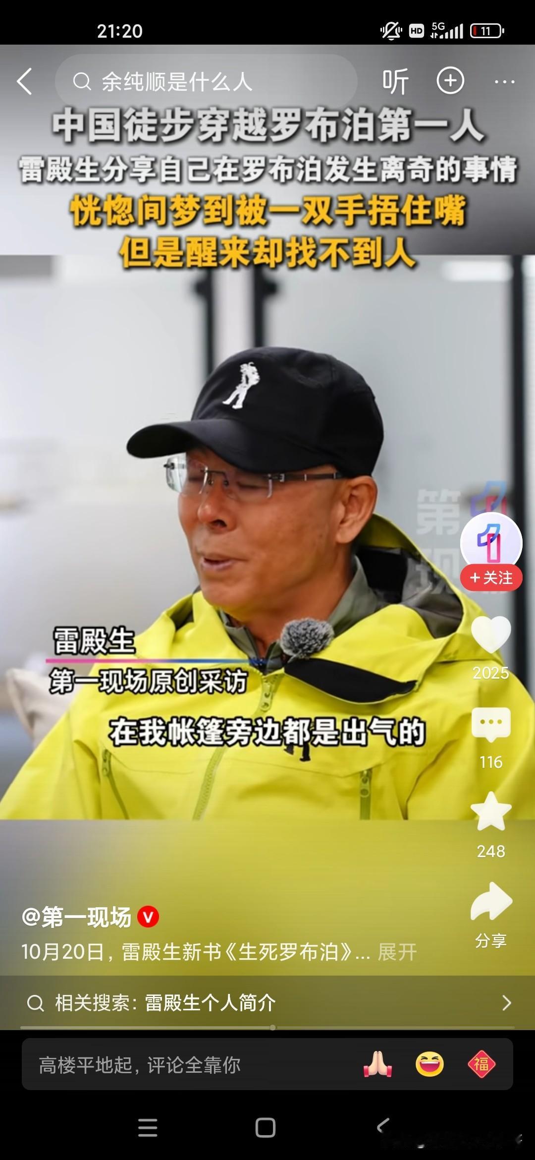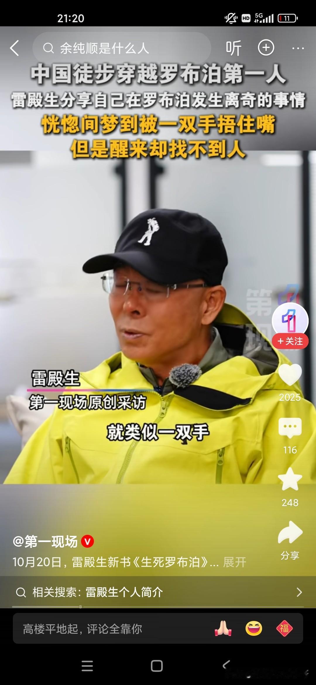 雷电生也真是狠人呐,自己徒步了中国边境线包括一些比较偏远的原始森林,或者说是山区呀,超过100000km,而且奇迹般的生存了下来,他说有两次他不敢睡觉,在其他地区基本上都可以睡得很香,第一个是西藏阿里地区遇到狼群的攻击,晚上手中始终攥着刀,一直不敢睡觉,第二的话是在罗布泊余纯顺的墓地周围,当时是自己搭了帐篷,晚上感觉到一个黑影蒙住了他的脸,掐住了他的脖子,他就呼吸不上气来,然后他自己拿着刀啊,狂乱挥舞,结果有一个黑影就从他那个帐篷里出去了,12点之后的话他再也不敢睡觉了,直到第二天天明他才敢出发,他说的感觉是真实的,但是一切都说不清楚,现在回忆起来他仍然心有余悸不是!