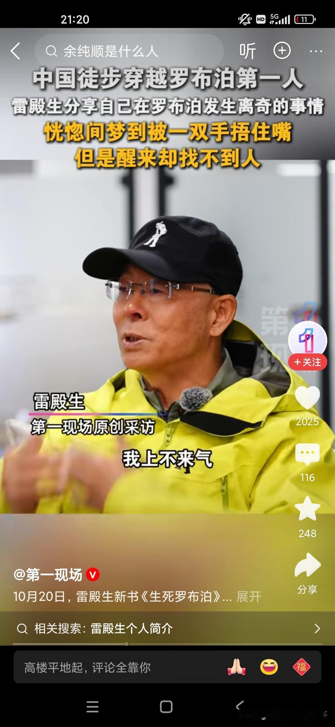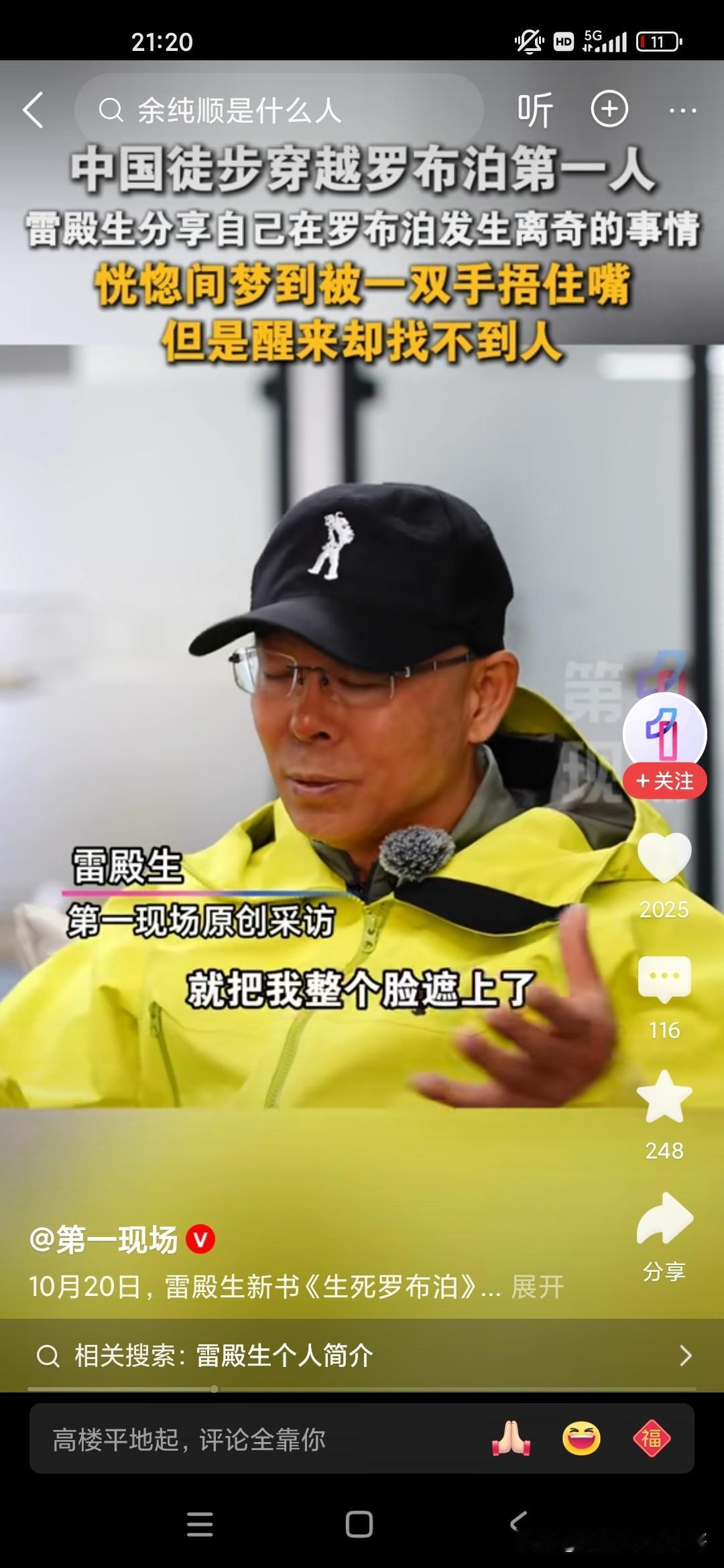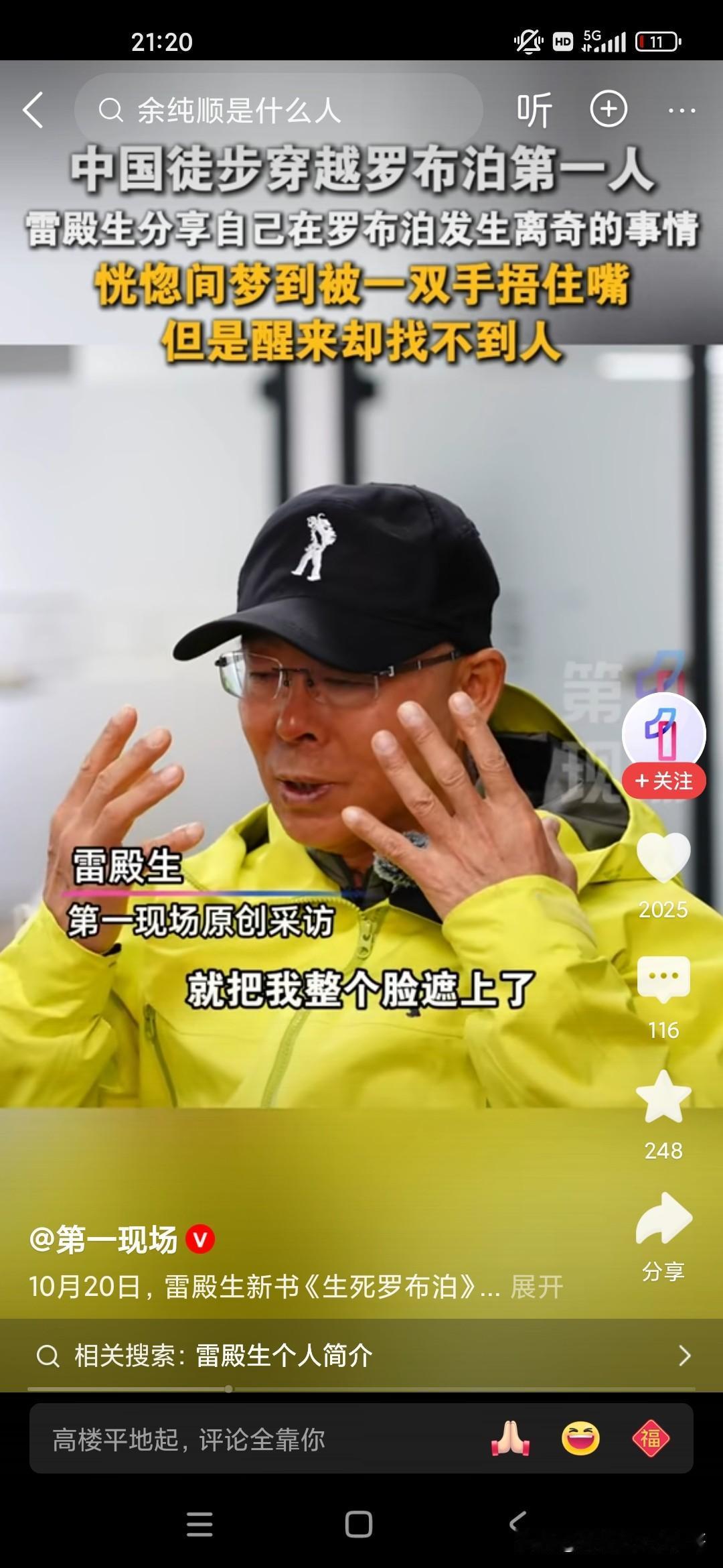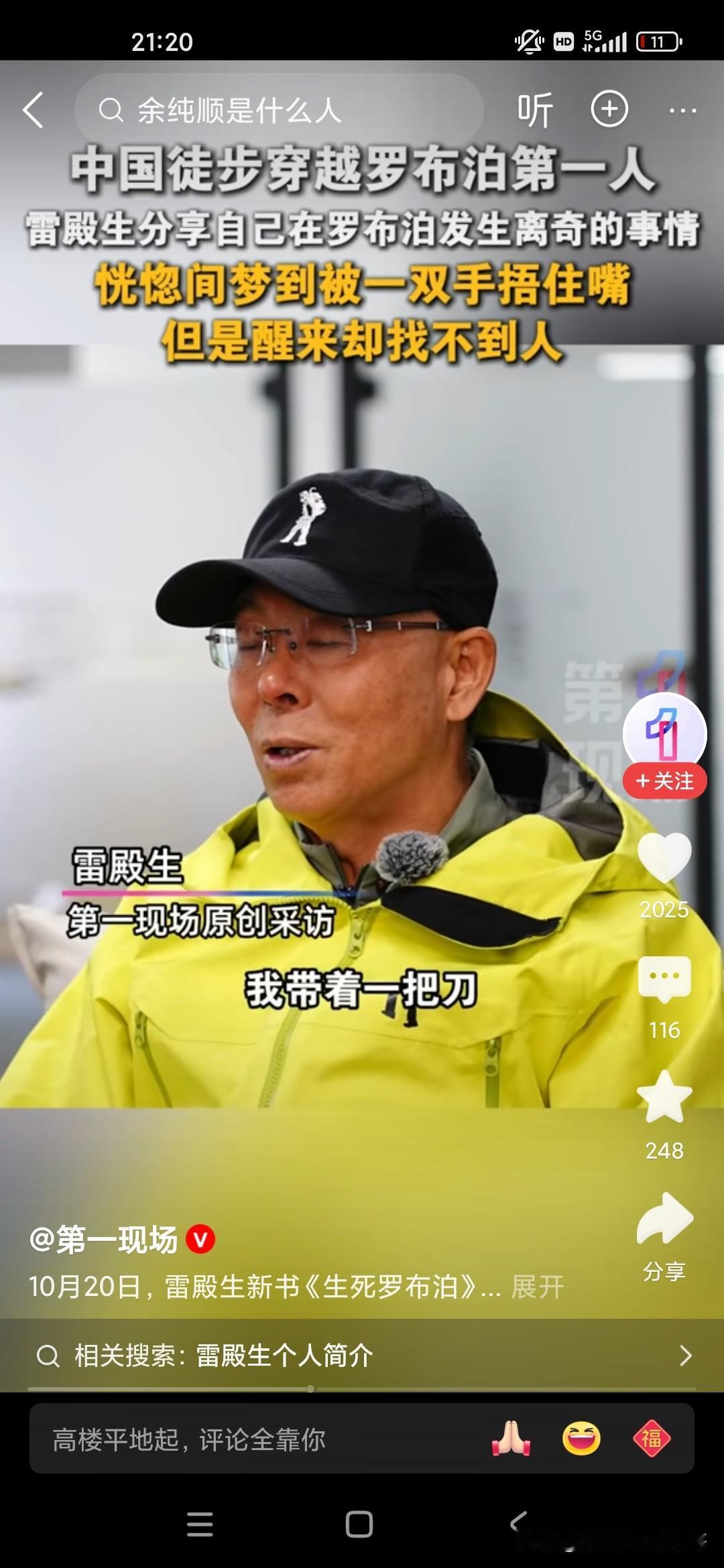 雷电生也真是狠人呐,自己徒步了中国边境线包括一些比较偏远的原始森林,或者说是山区呀,超过100000km,而且奇迹般的生存了下来,他说有两次他不敢睡觉,在其他地区基本上都可以睡得很香,第一个是西藏阿里地区遇到狼群的攻击,晚上手中始终攥着刀,一直不敢睡觉,第二的话是在罗布泊余纯顺的墓地周围,当时是自己搭了帐篷,晚上感觉到一个黑影蒙住了他的脸,掐住了他的脖子,他就呼吸不上气来,然后他自己拿着刀啊,狂乱挥舞,结果有一个黑影就从他那个帐篷里出去了,12点之后的话他再也不敢睡觉了,直到第二天天明他才敢出发,他说的感觉是真实的,但是一切都说不清楚,现在回忆起来他仍然心有余悸不是!