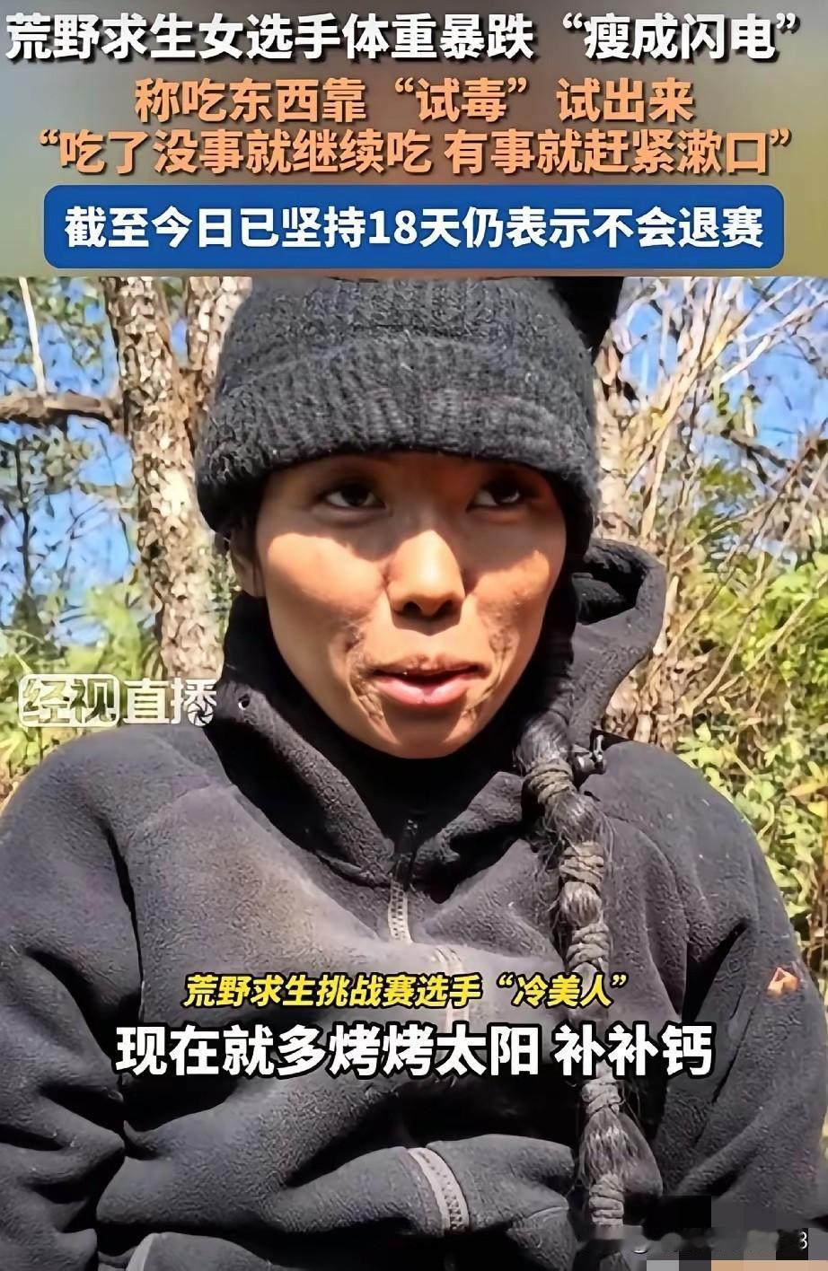 这才是女人减肥的真正法宝! 七星杯荒野求生里,仅剩的一位女选手——冷美人,已坚持了十八天,瘦得面目全非。 相比吃减肥药、做减肥操,不仅有副作用,且效果欠佳。极端环境下的生存挑战,才是减肥的绝佳方式! 当然,前提是你得有吃苦的决心和毅力!