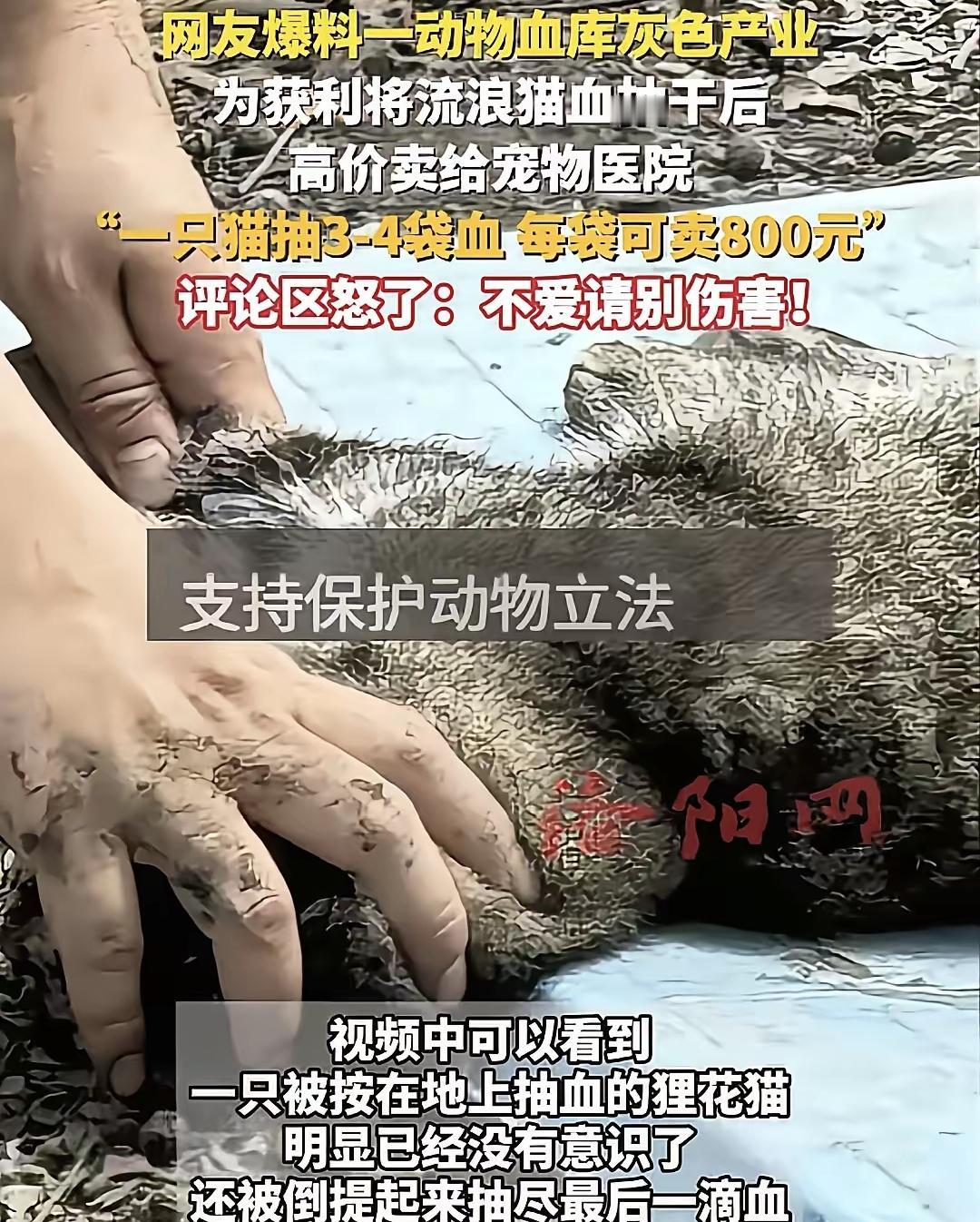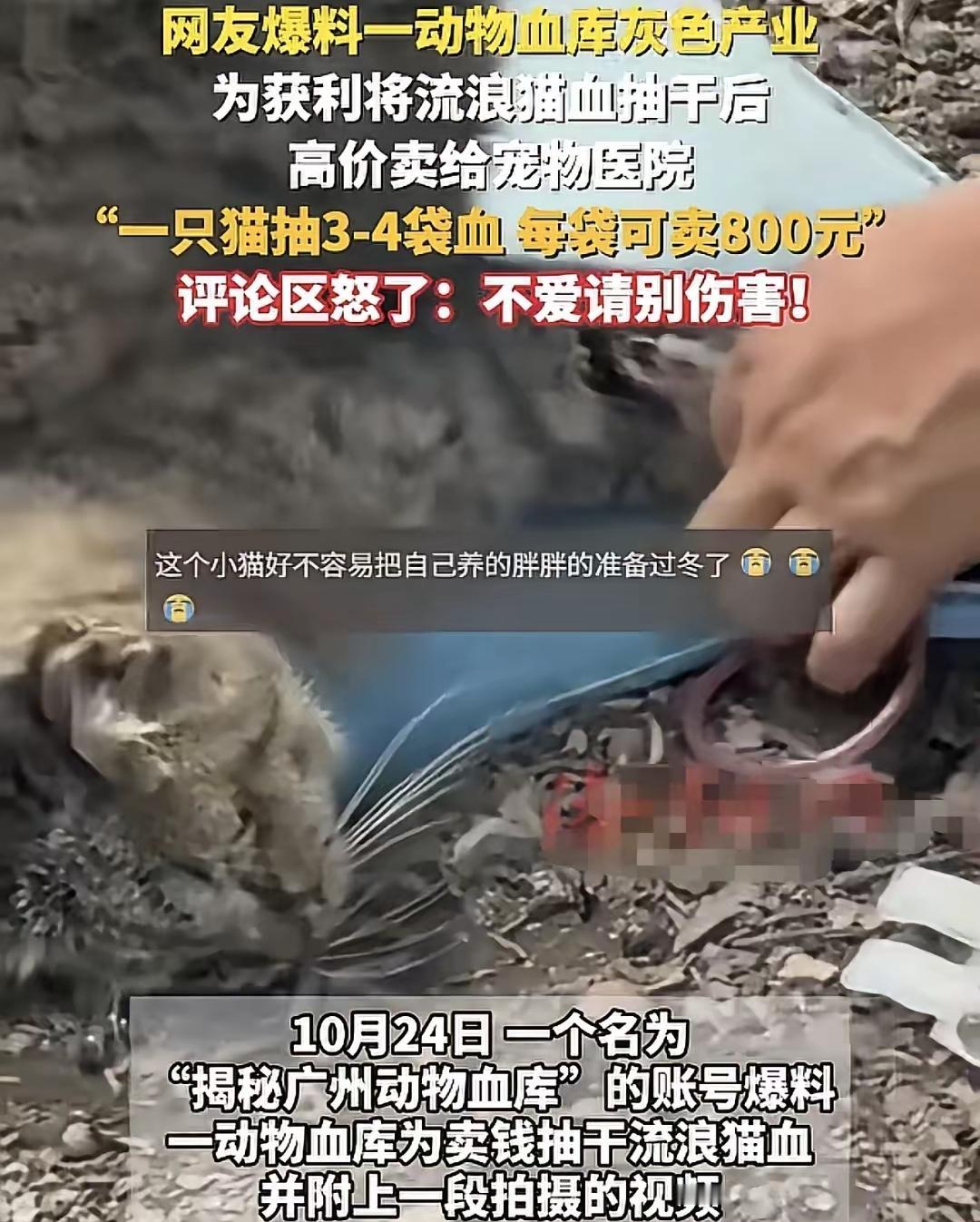 广州医院活抽猫血牟利这事儿,看完整个人都炸了!视频里那场景,真让人攥紧拳头——几个人徒手逮住路边流浪猫,往地上一按,铺块破垫子就拿针头往猫身上扎,血袋一接就没停过,直到猫耷拉着脑袋没反应,还在硬抽! 这些毛孩子多不容易啊,天天翻垃圾桶找吃的,好不容易长点肉过冬,转头就成了他们赚钱的工具。懂行的都知道,成年猫每公斤最多抽10ml才安全,可这帮人眼里根本没“生命”,只盯着一只猫能赚2400多块的黑心钱! 别拿“流浪猫没人管”当借口,没人疼不代表能被肆意糟蹋!这不是简单的虐猫,是明晃晃的牟利黑链啊。连小动物都容不下的人,心里得黑成什么样? 相关部门真该好好查查这整条产业链,把这些“毒虫”清干净!咱们普通人能做的,就是多转发让更多人看见——你说,要是没人站出来替不会说话的毛孩子发声,下次还会有多少生命遭罪?
