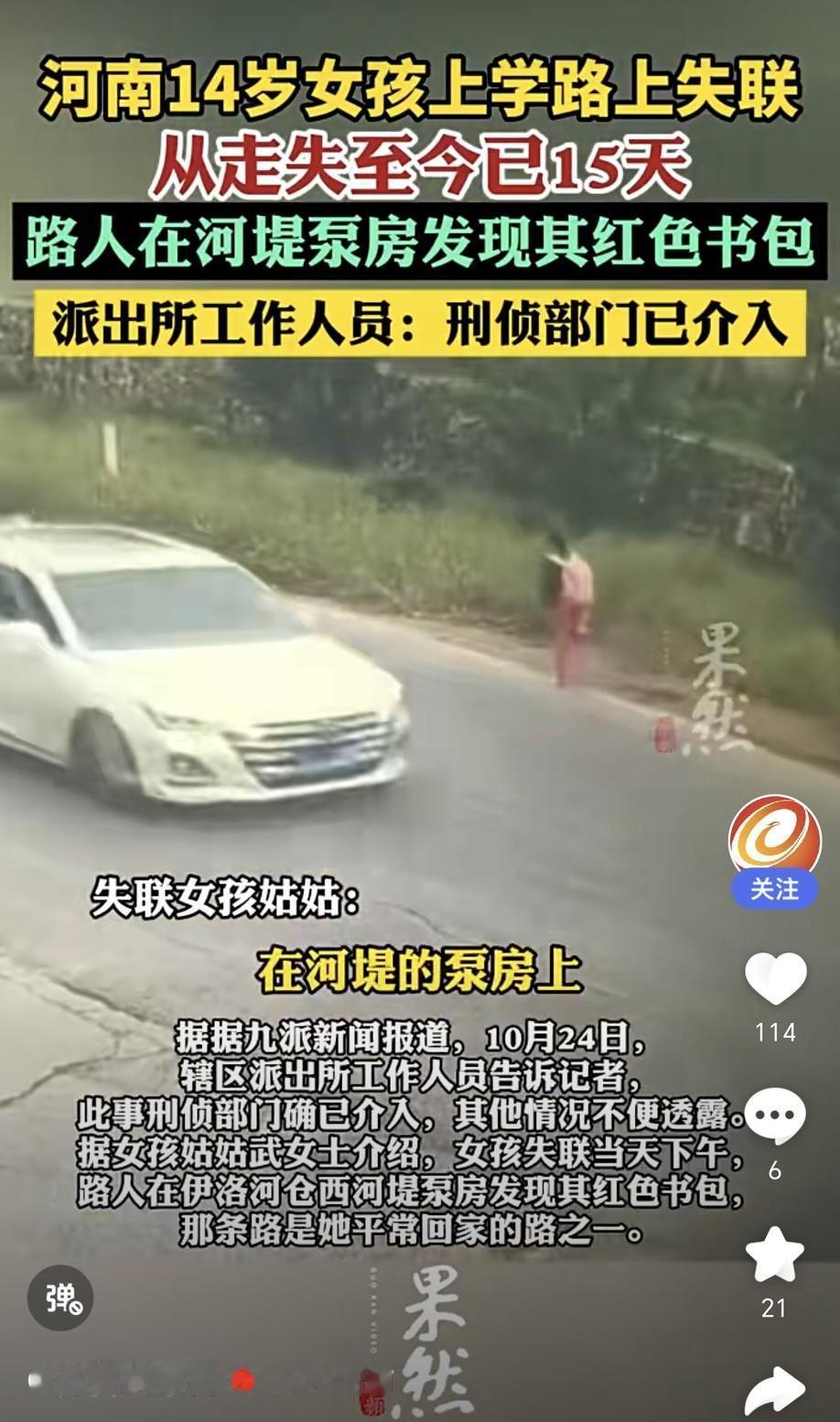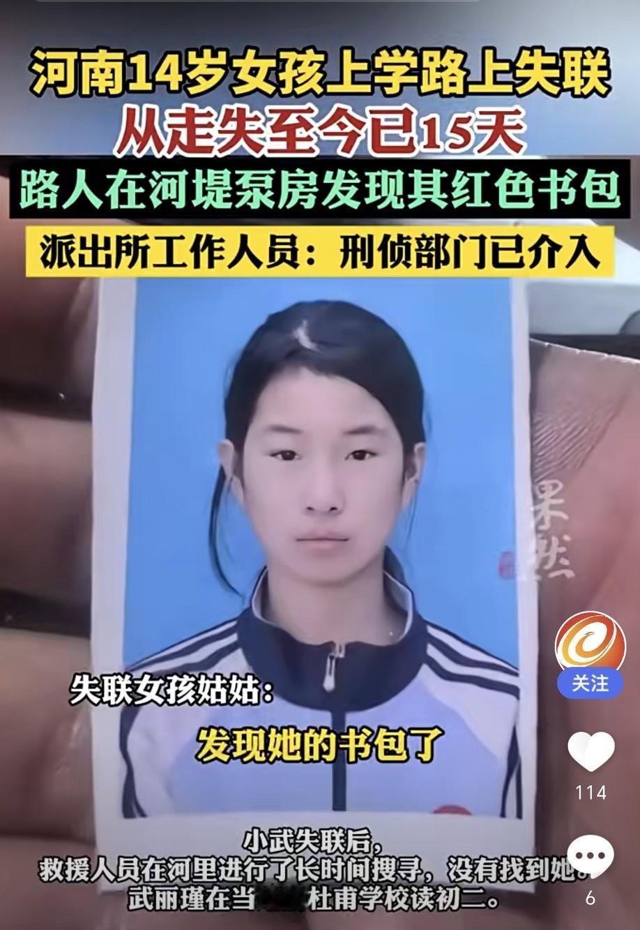 郑州14岁初二女孩武丽瑾上学途中失联。 10月9日,她被父母送到学校附近下车后,在杜甫学校门口没进去,独自走向伊洛河边就失去了踪迹。当天下午,路人在伊洛河仓西河堤泵房发现了她的红色书包。 女孩姑姑说,下车时孩子还和爸妈有说有笑,失联前也没和家人闹矛盾。从失联到10月24日,救援人员在河里打捞搜寻,却一无所获。 这就很奇怪了,下车时还和父母有说有笑,近期也没和家里人闹矛盾。本应到学校上学的孩子,到了学校门口却没进学校,而是选择了回家走的路之一,而且还失踪了。失踪当天下午就发现了她的书包,这么长时间,该找的地方都找了,就是没有孩子的踪迹。孩子也不小了,会去哪里呢?接送都还能出现这样的问题,还有"天理"吗? 现在公安刑侦部门已经介入调查,但具体情况还不清楚。希望警方能尽快查明真相,让女孩早日平安回家。