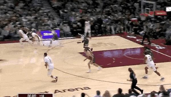 在雄鹿客场挑战骑士的第三节比赛中,字母哥前场抢断,持球一条龙推进,大步流星甩开防守单手劈扣终结快攻。 字母哥这球过了半场,从三分线外就开始突破上篮,两步就已经到了篮下,防守球员有心无力,只能眼睁睁看着他将球扣进。 一旦让字母加起速来,任何防守都是徒劳,能阻止他打进二加一就算成功,他不仅有速度,还有对抗,瘦弱一点的内线,能直接被撞飞。