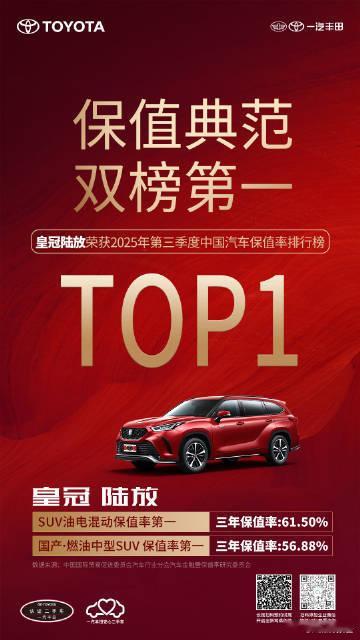 一汽丰田荣获2025年Q3汽车保值率排行榜第一