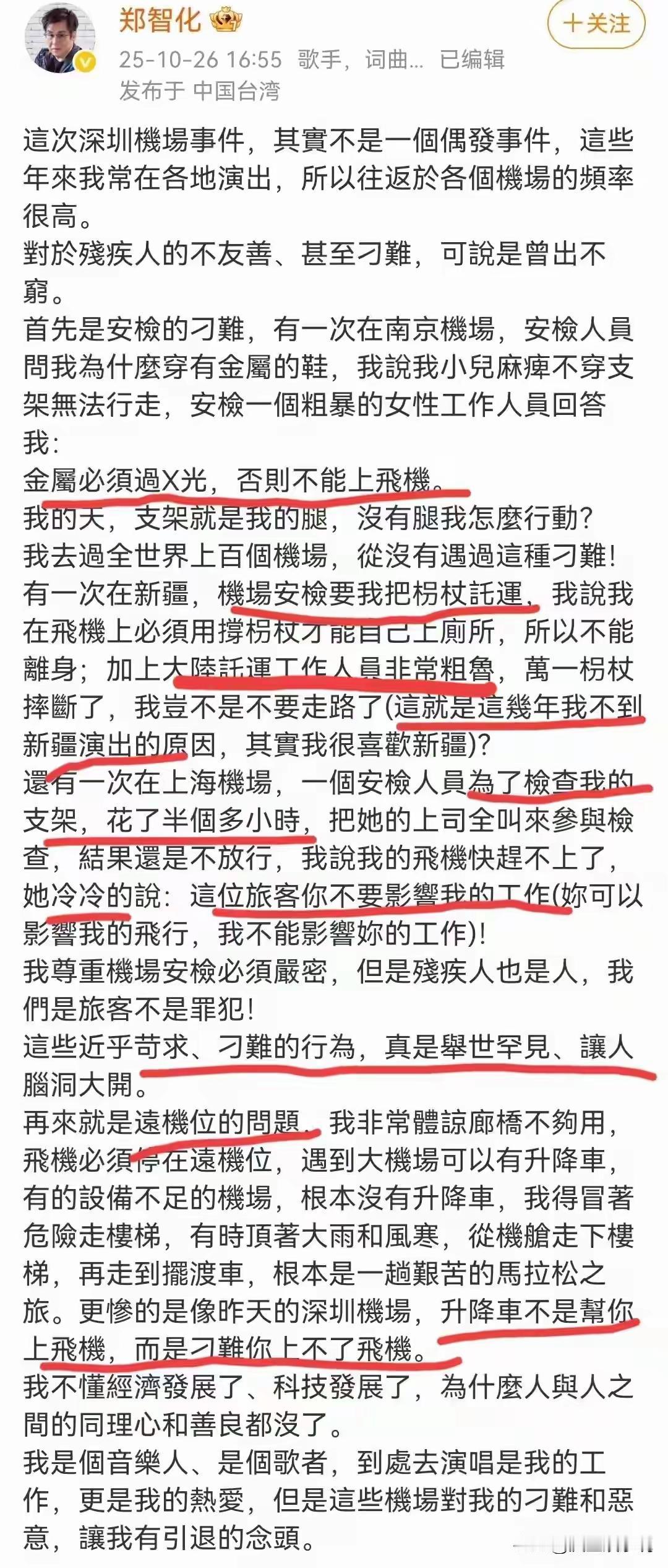 郑智化和机场这个事,谁对谁错,大家伙都吵疯了。 主要集中在两点,一个是公共服务上能否做到面面俱到和所谓人性,一个是郑智化的“连滚带爬”是不是有不纯目的。 第一点,公共服务可能有不完善的地方,这其实很正常。郑智化在对比了很多机场后,觉得在这里发生的事比较典型,所以特地拎了出来,可能与他当时所处的环境和心态有大关系。 升降车的距离是出于飞机安全考虑一类的自不用说,过安检什么的接受严格检查也无可厚非,就像判案一样的,过程稍微长一点也可以理解,因为有些情况可能确实不如表面看上去和想象的那么简单和便于操作,而且这些都是不固定的,也很难说可以形成什么“标准化流程”,所以当遇到这类事,只能尽可能配合争取快速处理,大家一般也都是这么想的和做的。 视频看了,工作人员是有参与的,虽然说郑智化自己上去的时候有些左右晃荡,看上去是有些吃力,他自我理解成“连滚带爬”倒也不至于太夸张,毕竟湾湾那边的人有很多说话都很大个,有时候我们自己说话也喜欢“添油加醋”,(一种描述方式),只能说妥与不妥,上升到人格高度,大可不必。 而且很多人有提到“冷眼旁观”这个问题,郑智化的原文其实说的应该是“升降车司机”,而不是说的全体工作人员,郑智化不可能连这点基本素质也没有,遇到谁都随便开喷,只是他可能当时只想着贬义的部分没有想着那些帮助过他的人的一丝善意吧。这个也受限于当时的心态吧。不够冷静是真的,不过有时候发文不就是这样的吗,只能想到当时的情况。 第二点,郑智化作为一个“公众人物”,一言一行自当斟酌完毕再行动,这样明显是能更保住影响力和形象,不管他的目的是出于改善现有环境还是说单独只是为了发牢骚,其实都无可厚非,前者自然更好,后者如果是这样,也只能说写文水平可能还有待提升。 首先之前他说的是“深圳机场”的态度是最没人性的,这是这段话的前半部分的主语和主体,这个帽子扣得太大了,有些主次不分了,毕竟,哪里都有好人坏人,不可能因为一个人而影响对整个环境的判断和定论,这显然是不妥的。后半部分,主要是说升降车司机不顾他的个人安全和冷眼看他进飞机,首先,这个司机可能是没有扶他上去的“责任或义务”的,其次,这个司机可能操作是有些不当,但也许也是因为从来没有遇到过这种情况所以有些不知所措,也只能算是个“小失误”吧,虽然这可能是“事实”,但用一些太绝对的措辞自然是不好。 总之,理性看待客观事实和主观意识,才可能让我们不至于太偏颇,太随波逐流。
