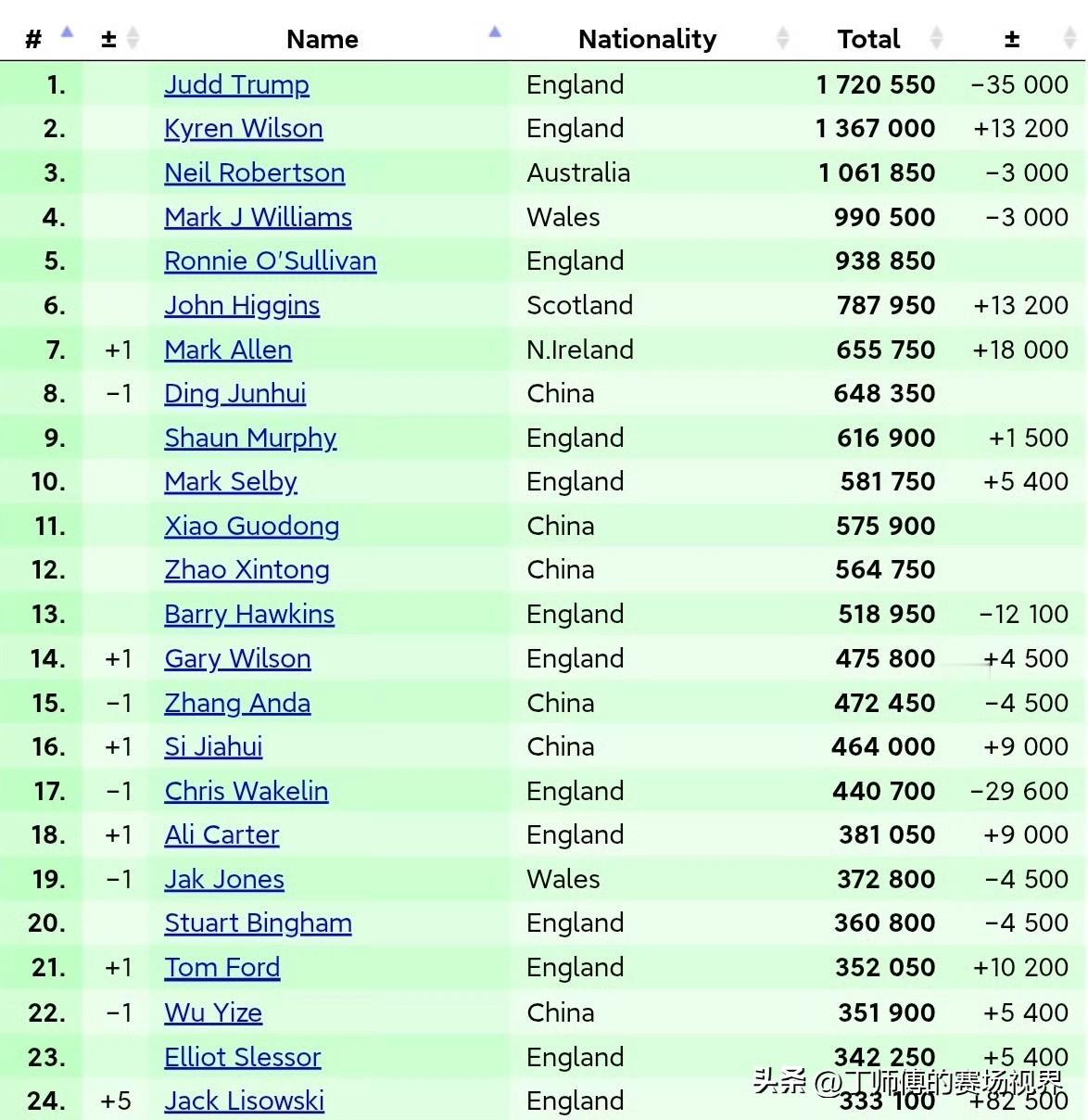 斯诺克北爱尔兰公开赛过后最新一期世界排名公布: No.1:🏴󠁧󠁢󠁥󠁮