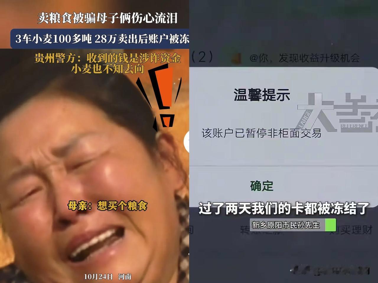 想了一晚上 总算明白“卖粮食银行账户被冻结”,整个事件让人不舒服的地方是“一扣了之” 河南新乡的孙先生和母亲,原本也以为2025年10月的这笔卖粮交易能让家里踏实一阵,却没料到,一场看似正常的买卖,最终把他们拖进了"粮去钱冻"的绝境里。 2025年10月17日,他通过网络平台结识了一位自称是外地收粮老板的人,对方开口就说要"高价收粮",给出的报价约1.4元/斤,比当时的市场价略高一点,算不上离谱,却足够有吸引力。沟通中,对方对粮食质量、数量都没过多挑剔,只说要100多吨,大概能装3车,总价算下来28万元,还承诺"现场监装,装完就打款"。 对于孙先生来说,这样的交易条件很常规,银货两讫,过了几日,孙先生准备去用这些钱去还掉银行收粮时的借款。没想到,银行卡里的钱怎么也转不出来!!银行工作人员告知,冻结原因是账户里的28万元涉及诈骗赃款。 孙先生立马联系之前的买家,就根本联系不上!!现在28万元取不出来,欠的贷款还不上,接下来一家人的生计都成了问题。 对于如此狡诈的诈骗犯真的是防不胜防!!但这种冻结受害人账户这种方法真的有用吗??难道不是应该追踪诈骗犯??