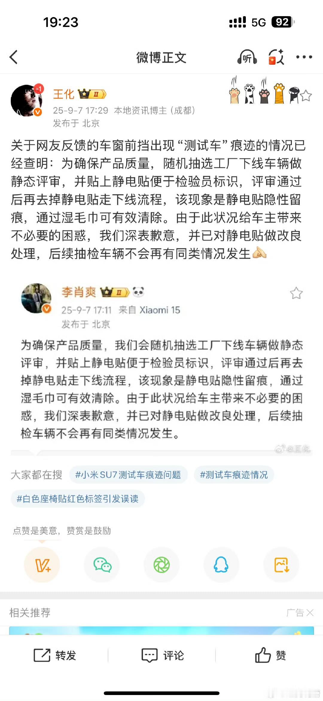 又一位车主发现自己购买的小米汽车上有测试车的标记!此前小米集团表示将更改后续流程,不会出现相关的印记! 实际上在2025年9月7日的时候,小米汽车副总裁李肖爽已经在个人的社交频道上回应过一次类似的事件,当时他承诺的是以后不会再出现同类的事情,结果有位购买该车的人又发现了类似的情况。 看来小米时隔两个月还是没有改好这个静电贴纸的问题,各位是怎么看的?欢迎评论区留言。