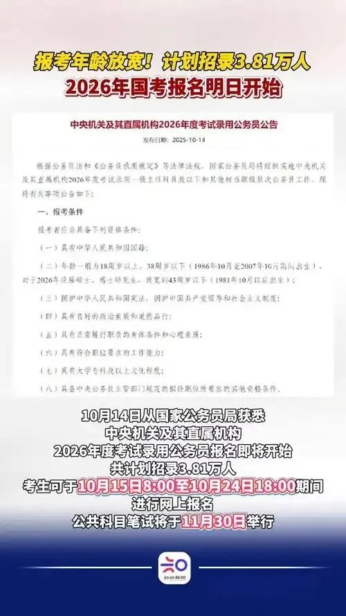“38 岁还能考公?我没看错吧!” 今早国考公告一出炉,后台瞬间被这类消息刷爆。那个卡了无数人半辈子的 “35 岁门槛”,居然在国家层面首次撕开了口子 ——2026 年国考将报考年龄上限提至 38 岁,应届硕博更放宽到 43 岁。这可不是简单加 3 岁,背后藏着影响所有职场人的大信号。