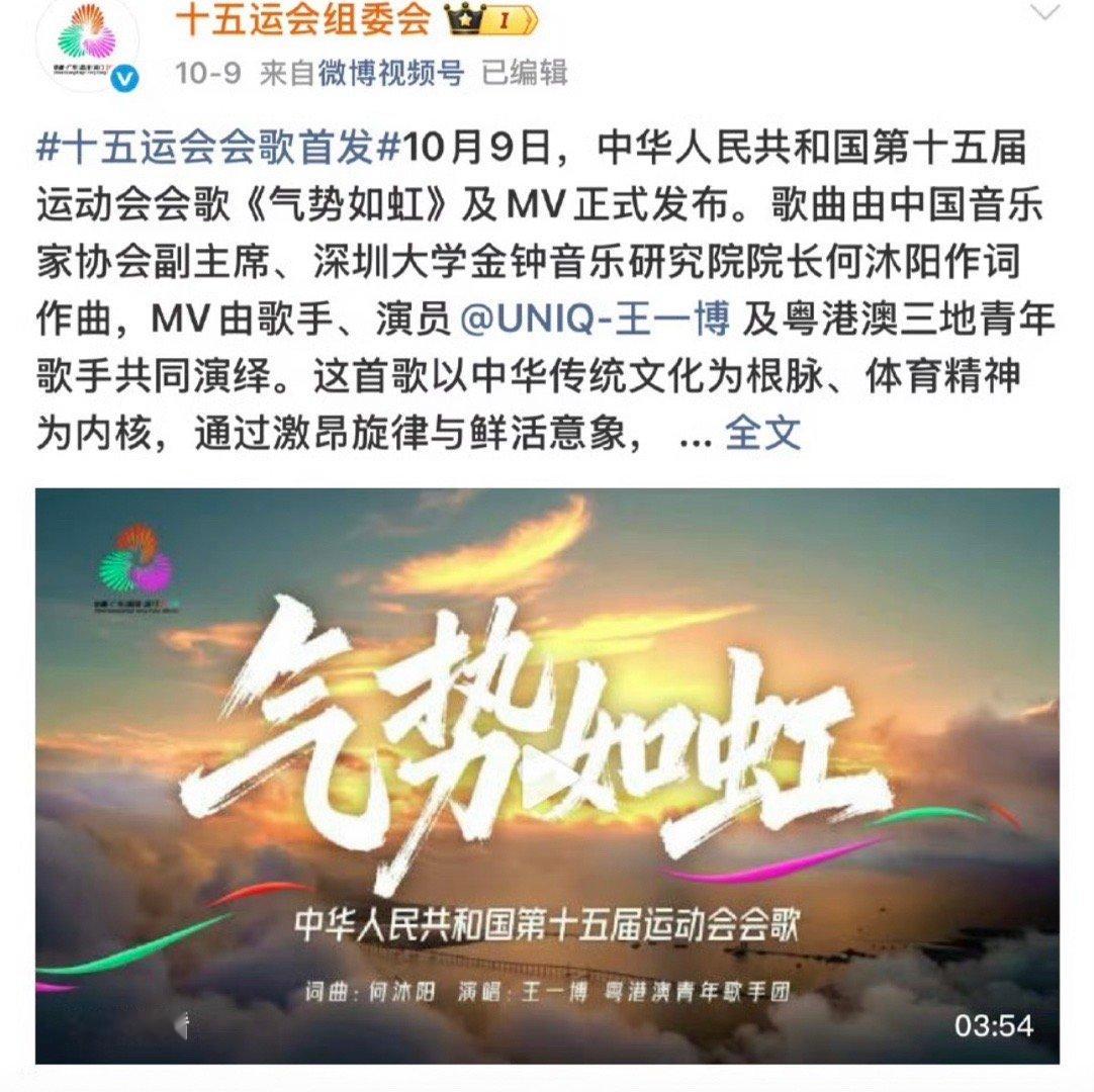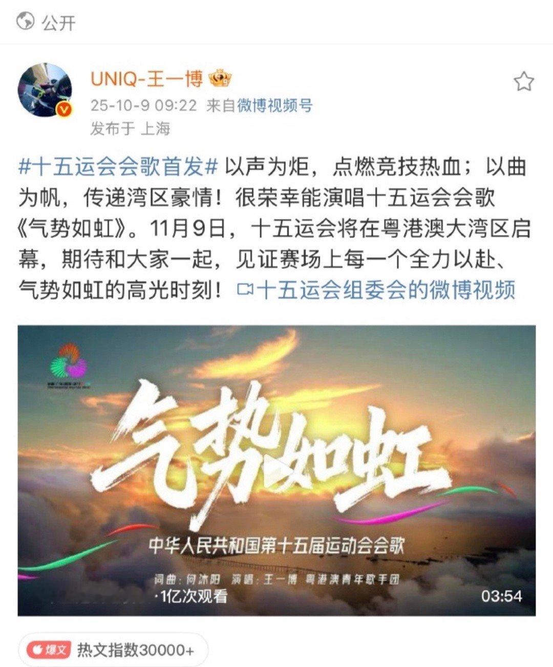 报,王一博全运会会歌气势如虹播放量破亿!!!🔥
