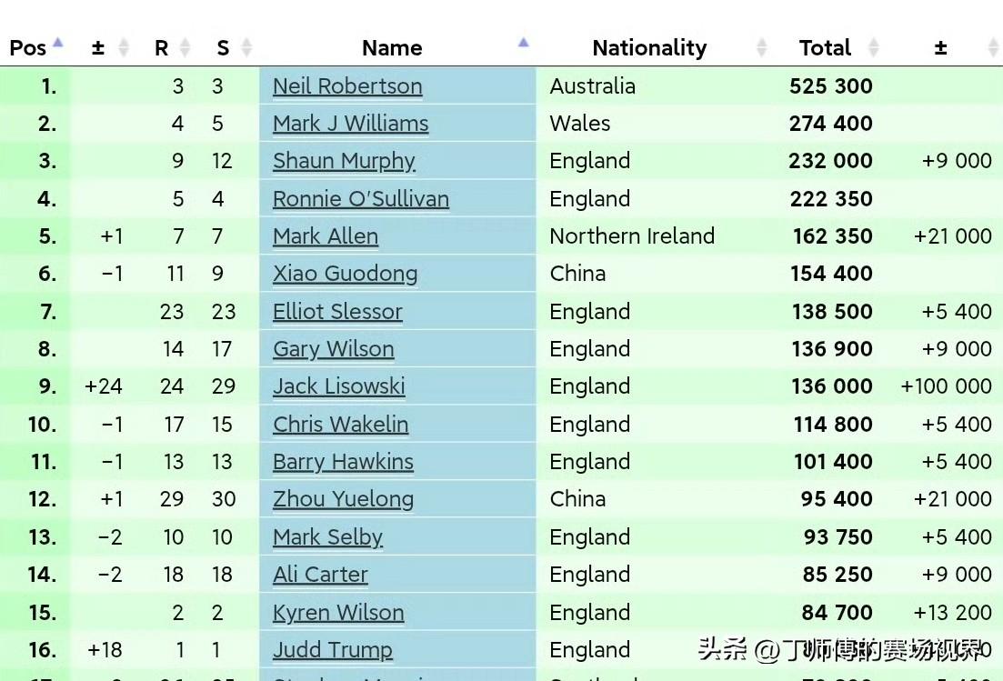 随着利索夫斯基夺得北爱尔兰公开赛冠军,斯诺克单赛季排名发生变化: 单赛季第1:🇦🇺罗伯逊 525,300(无变化) 单赛季第2:🏴马威 274,200(无变化) 单赛季第3:🏴墨菲 232,000(+9,000) 单赛季第4:🏴奥沙利文 222,350(无变化) 单赛季第5:🇮🇪艾伦 162,350(+21,000) 单赛季第6:🇨🇳肖国栋 154,400(无变化) 单赛季第7:🏴斯莱瑟 138,500(+5,400) 单赛季第8:🏴g-威尔逊 136,900(+4,000) 单赛季第9:🏴利索夫斯基 136,000(+100,000) 单赛季第10:🏴韦克林 114,800(+5,400) 单赛季第11:🏴霍金斯 91,450(+5,400) 单赛季第12:🇨🇳周跃龙 91,400(+4,400) 单赛季第13:🏴塞尔比 93,750(+5,400) 单赛季第14:🏴卡特 85,250(+9,000) 单赛季第15:🏴k-威尔逊 84,700(+13,200) 单赛季第16:🏴特鲁姆普 80,350(+45,000) (单位:英镑) 凭借10万英镑的冠军奖金,利索夫斯基升至单赛季第9,特鲁姆普收获4.5万亚军奖金也出现在前十六当中,而本赛季表现最好的中国球手还是肖国栋和周跃龙,前者高居第六,后者一次决赛一次半决赛的经历也排在第12。