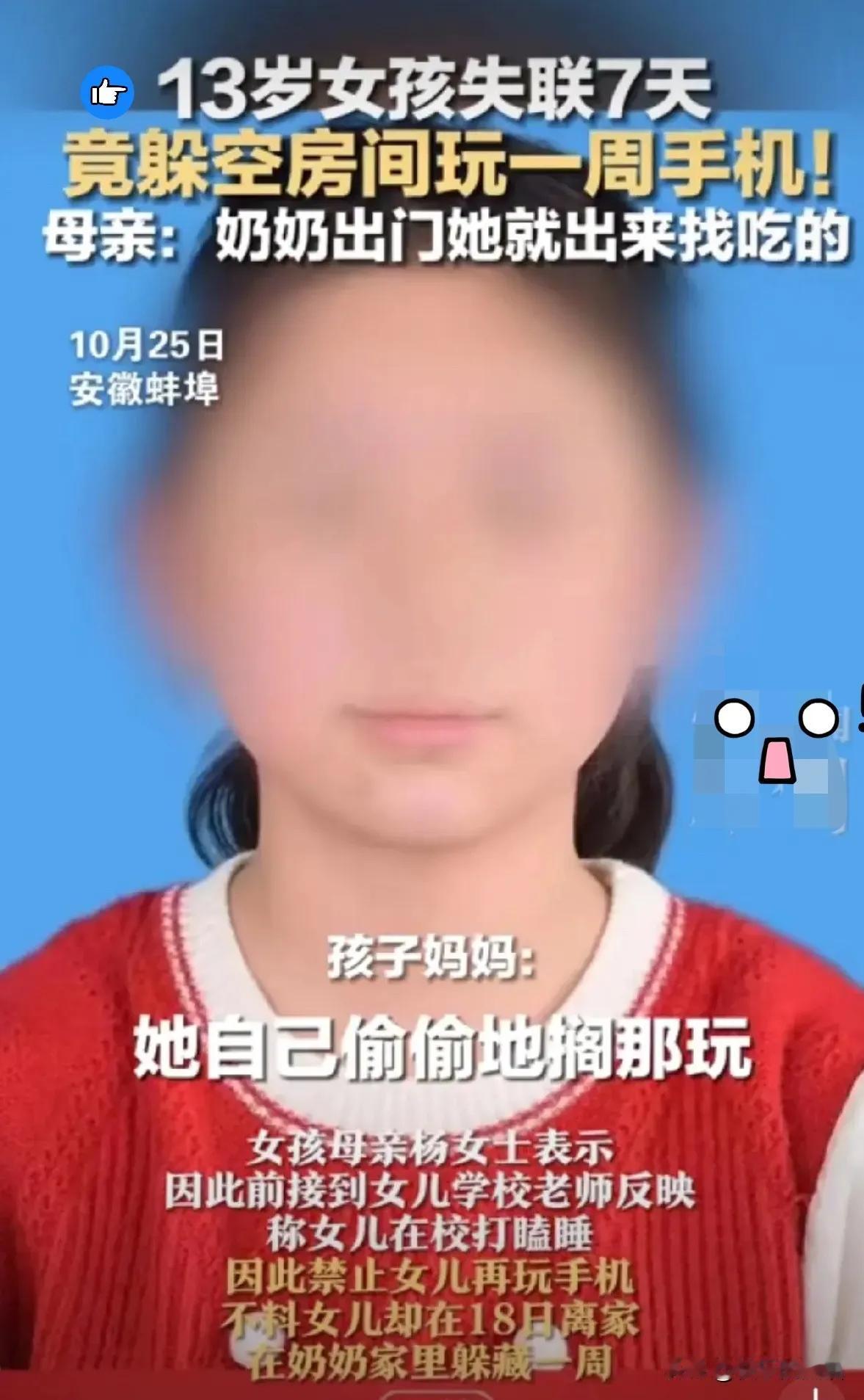 安徽一个13岁的女孩,上课犯困睡觉,妈妈就限制她玩手机,没想到没过几天,孩子居然带着手机偷偷跑了。一家人急得团团转,发动全村人找,最后在孩子奶奶家的空房子里找到了她。原来她一直躲在那儿,等奶奶出门就出来找吃的,其余时间全抱着手机玩。 这孩子才上初中就这么沉迷手机,真是让人揪心。但也不能全怪手机,它本身是工具,关键看怎么用。现在的孩子自控力还没发育好,手机里的算法推荐、游戏奖励很容易让人上瘾 ,依赖重也能理解。 这事儿明显反映出家长的引导不到位。一味限制只会引发逆反,得和孩子商量着定规则,比如每天用多久、什么时候能用,还得让她知道过度玩手机伤眼睛、影响学习 。 学校也得搭把手,多搞点体育活动、兴趣课程,让孩子觉得现实生活比手机有意思。社会上也该多建些青少年活动中心,给孩子更多线下玩耍的选择,这样他们自然不会总盯着手机了。