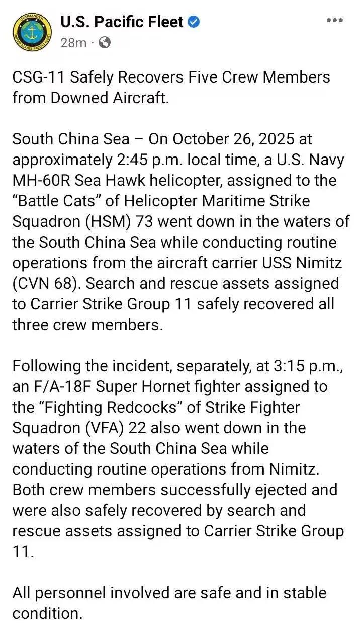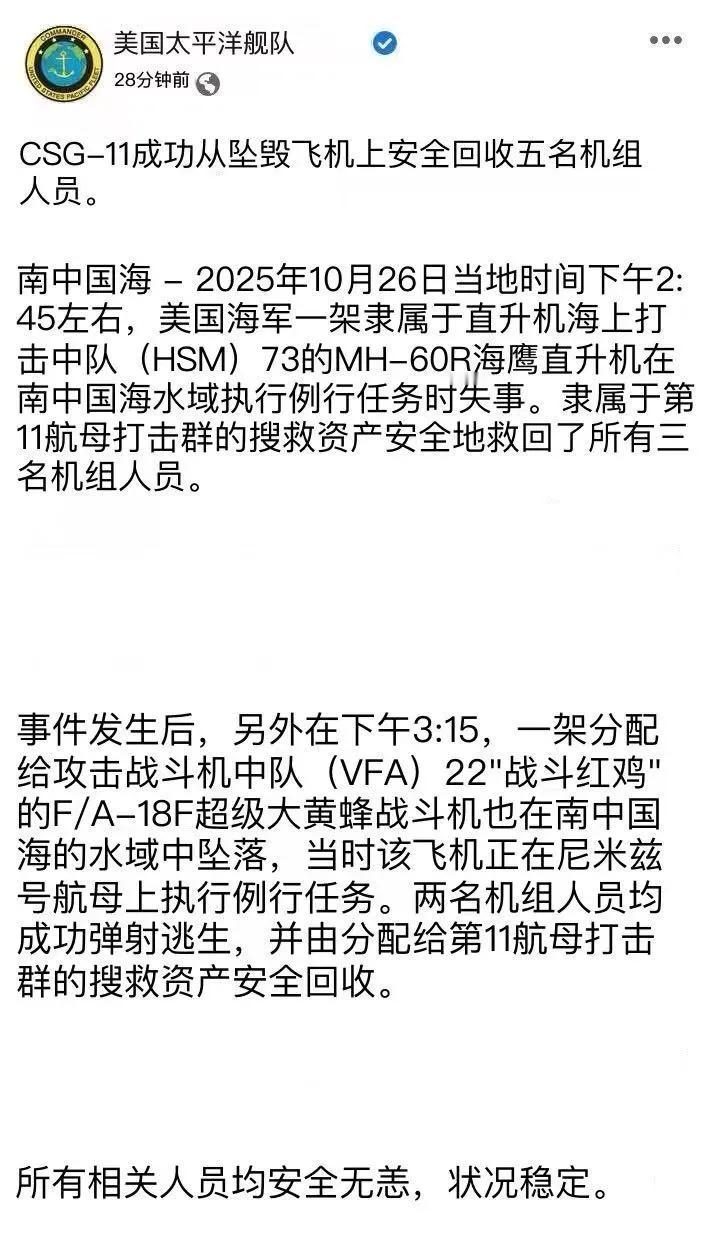 在10月26日的南海坠海事件中,还以为是美国海军先摔F-18舰载机,然后起直升机