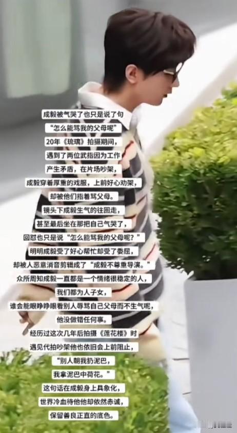 这是真的吗?成毅还受过这么大委屈! 20年拍《琉璃》时,他穿着厚戏服劝架,没招谁没惹谁,就因为拦了两句,被人指着鼻子骂父母。那么稳重一人,当场气到往回走,坐那儿把自己哭成泪人,就憋出一句“怎么能骂我爸妈呢”。 更气人的是,好心劝架还被造谣“不尊重导演”,这锅背得也太冤了。换谁听见别人骂自己爹妈,能不炸?他没发作已经够克制了。 后来拍《莲花楼》,遇到代拍吵架,他还是往前冲,说“别人欺我朋友,我拿泥巴当荷花”。哪怕吃过亏,也不会袖手旁观。
