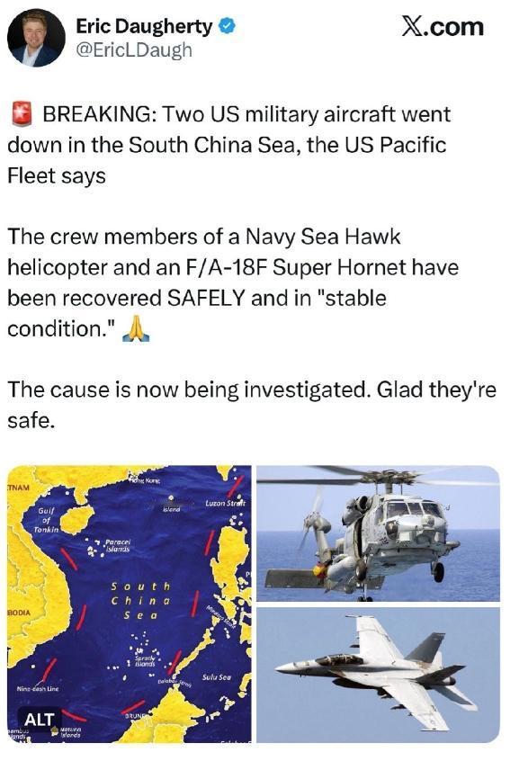 突发:美国太平洋舰队称,两架美军飞机在南海坠毁。 一架海军“海鹰”直升机和一架 F/A-18F“超级大黄蜂”的机组人员均已安全获救,状况稳定。 网友表示:不开工资我就把飞机给你扔海里,当然咱不能把小命也扔进去这个把握还是有的,过几天再不开工资我就给你放几颗大爆竹! 美国还在开着四处漏风的破飞机在全世界炫耀武力,以后这样丢人现眼的事会更加频繁的发生 对此你怎么看?