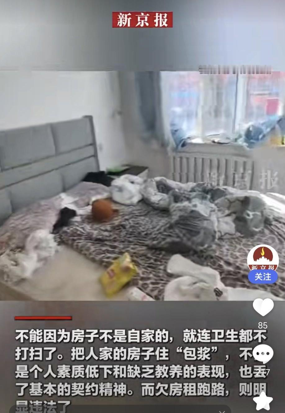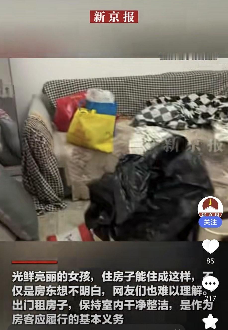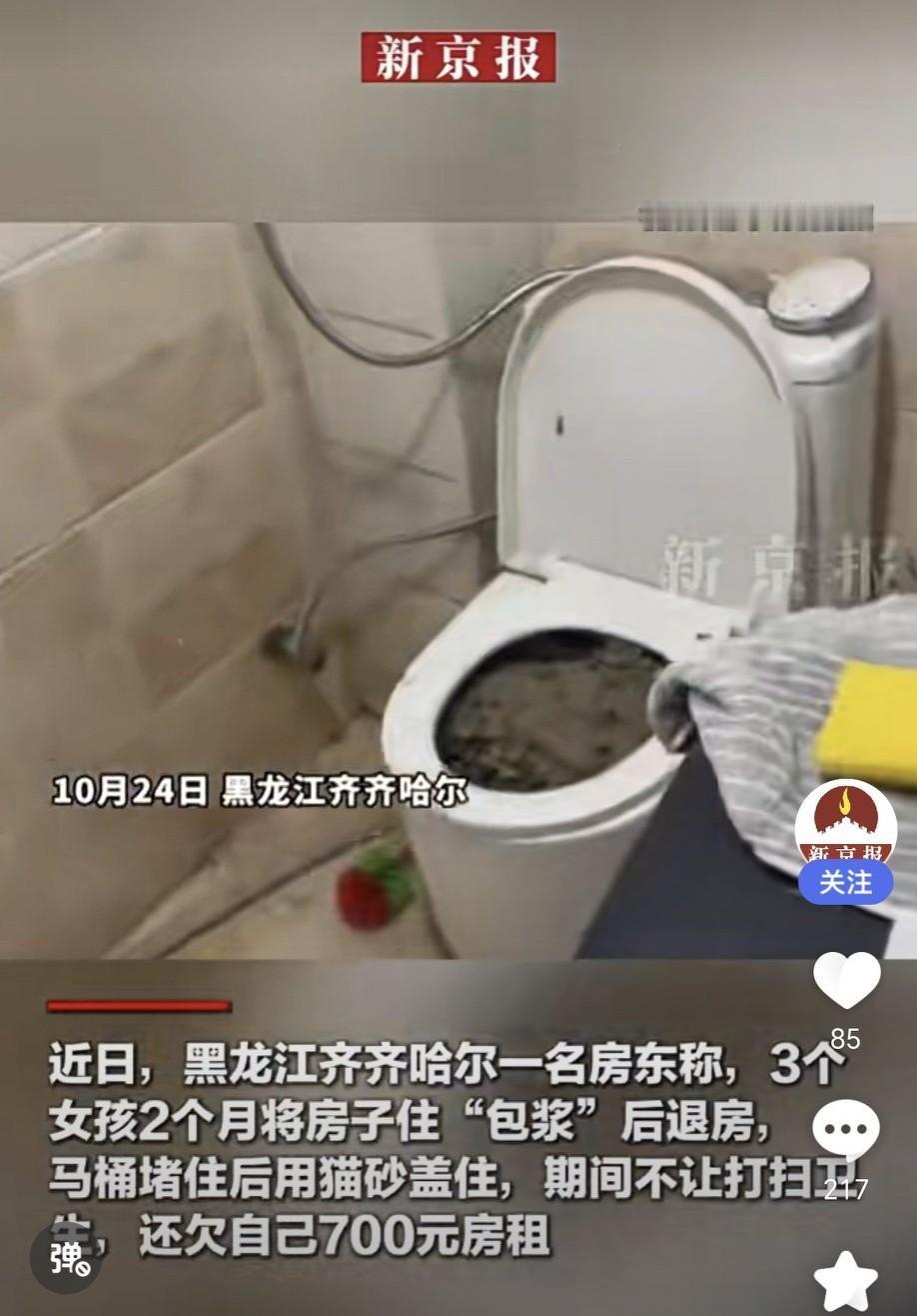 黑龙江齐齐哈尔的房东宋先生,把房子租给3个女孩,才两个月,女孩们半夜退房,留下“包浆”了的房子。 马桶被堵,上面还盖着猫砂,打开一看,下面全是大便,保洁看了都差点落泪。屋里满是生活垃圾,家具窗帘也被破坏。5个人花了6小时才清理干净,宋先生自己还吐了俩小时。 更过分的是,这仨女孩还欠700元房租。宋先生报警后,女孩主动联系他,但说拿不出这么多钱。 A网友:我真是想不到,人怎么可以懒到这种程度,也想象不到,人怎么可以在这样的环境里面生存的。 B网友:说句实话,现在是愿意把房子租给夫妻带小孩借读的或者办公用房,都不愿意租给这帮小子和丫头片子,特别是几个女孩一起住的那种。 现在有些租客就这样,出门外表看着光鲜亮丽,内心实则破败不堪,不是他们的房子不会心疼。这租房啊,房东真得擦亮眼睛,不然就等着闹心吧。