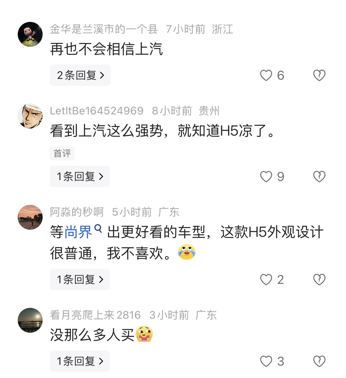 当上汽董事长喊出那句话,我知道尚界H5完了。 他以为只要搭上华为就能大卖 结果尚界H5销量远不及预期 市场给上汽一个响亮的耳光 话不能乱喊,也不能跪舔: “尚界铺天盖地,华为顶天立地”。 这句话一喊出来 看似气势十足,实则是盲目自信 话里话外还有浓郁的跪舔华为的气息。 不过尚界H5的销量应该过一段时间会有起色。