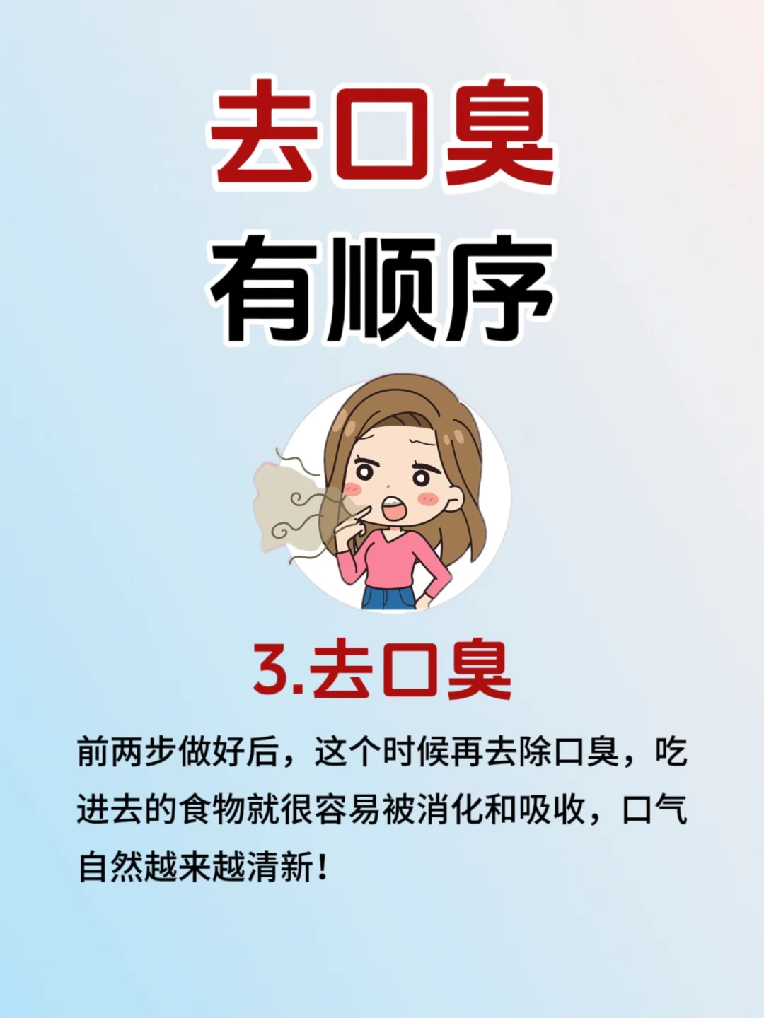 前两步做好后,这个时候再去 除口臭,吃进去的食物就很容易被消化和吸收,口气自然越来越清新!